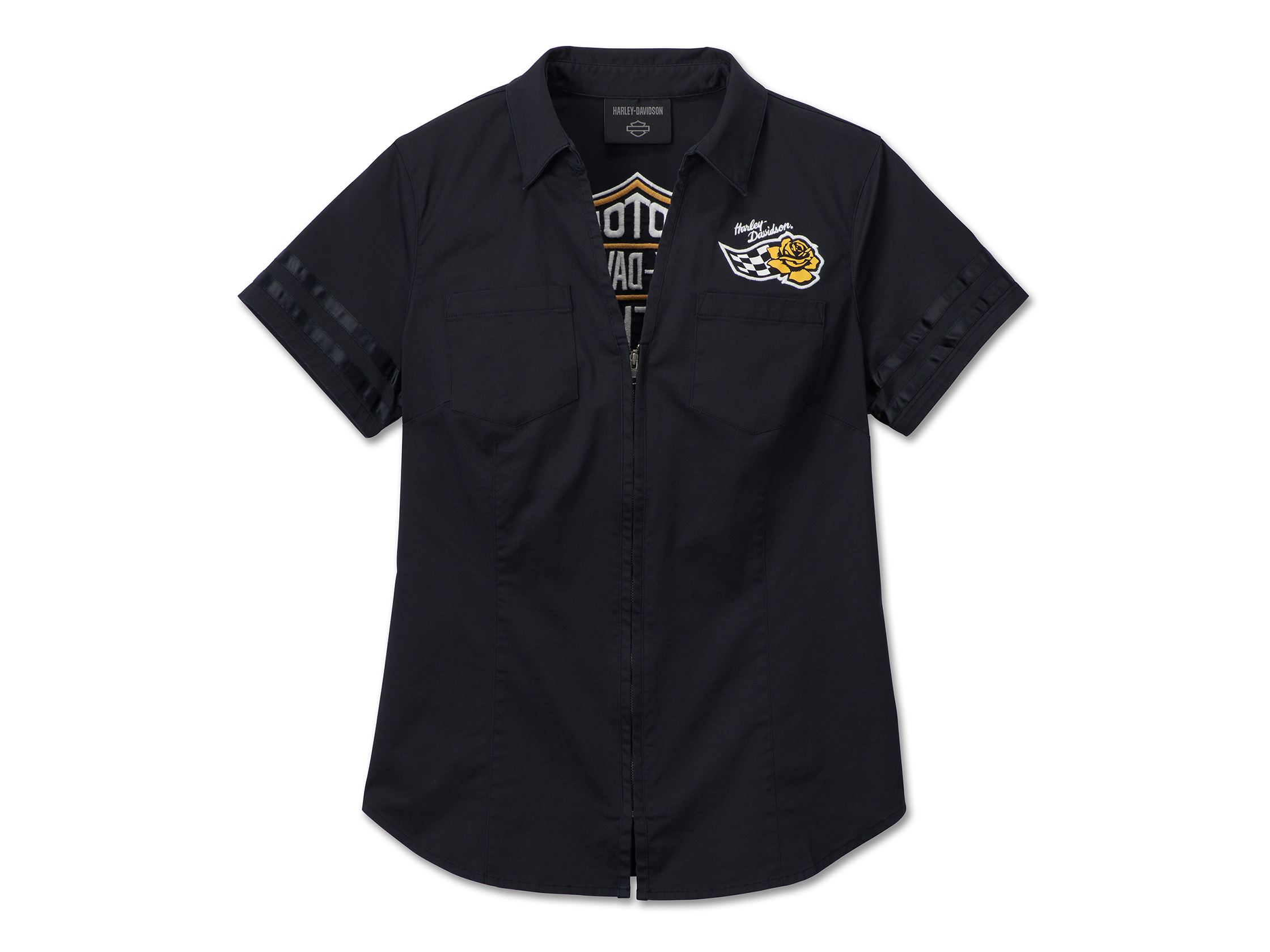 For casual style that applauds Harley-Davidson racing, get the Limited-Edition Bar & Shield Zip Front Shirt. Its cotton twill build has a hit of spandex for added stretch, and satin sleeve taping for added dimension. Features a flattering shirttail hem, back darts for a shapelier silhouette, and a hidden snap-down collar that stays put under your riding gear. Our scripted branding and seasonal rose-inspired racing graphics grace the front, while our most iconic logo fills the back. Add race-loving style on top—match this short sleeve women's knit top with our Rose Racer Adjustable Baseball Cap (97729-24VW). Supplies of both these are limited, so order now.