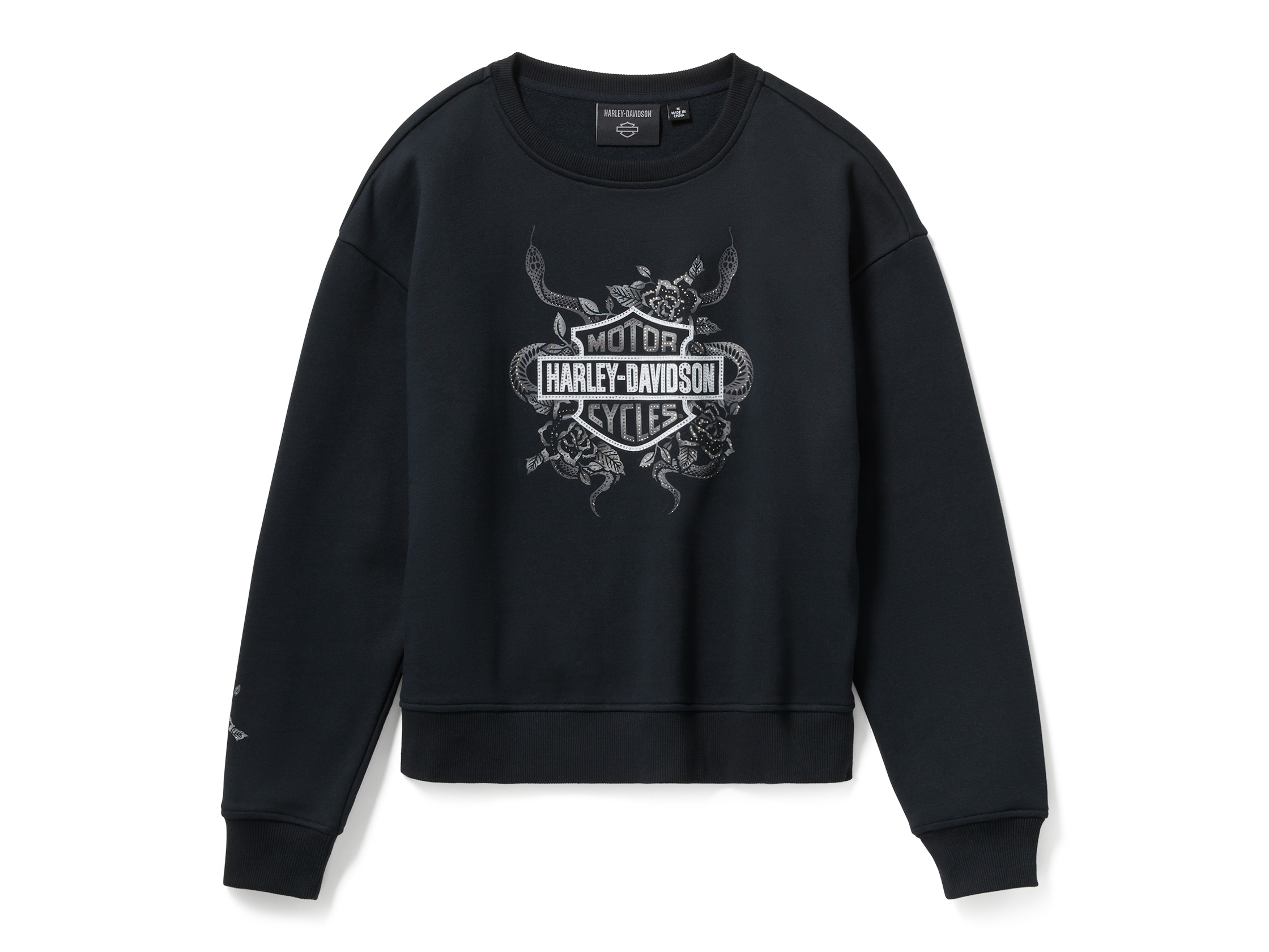 Proof that a sweatshirt can be comfy with an edge is here on our Serpent Rose Bling Fleece. It's crafted from cotton/polyester fleece with drop shoulders for a relaxed fit and rib-knit trim to help keep its shape. But what makes this women's crewneck turn heads is its striking reptile-meets-rose design adorned with rhinestones.