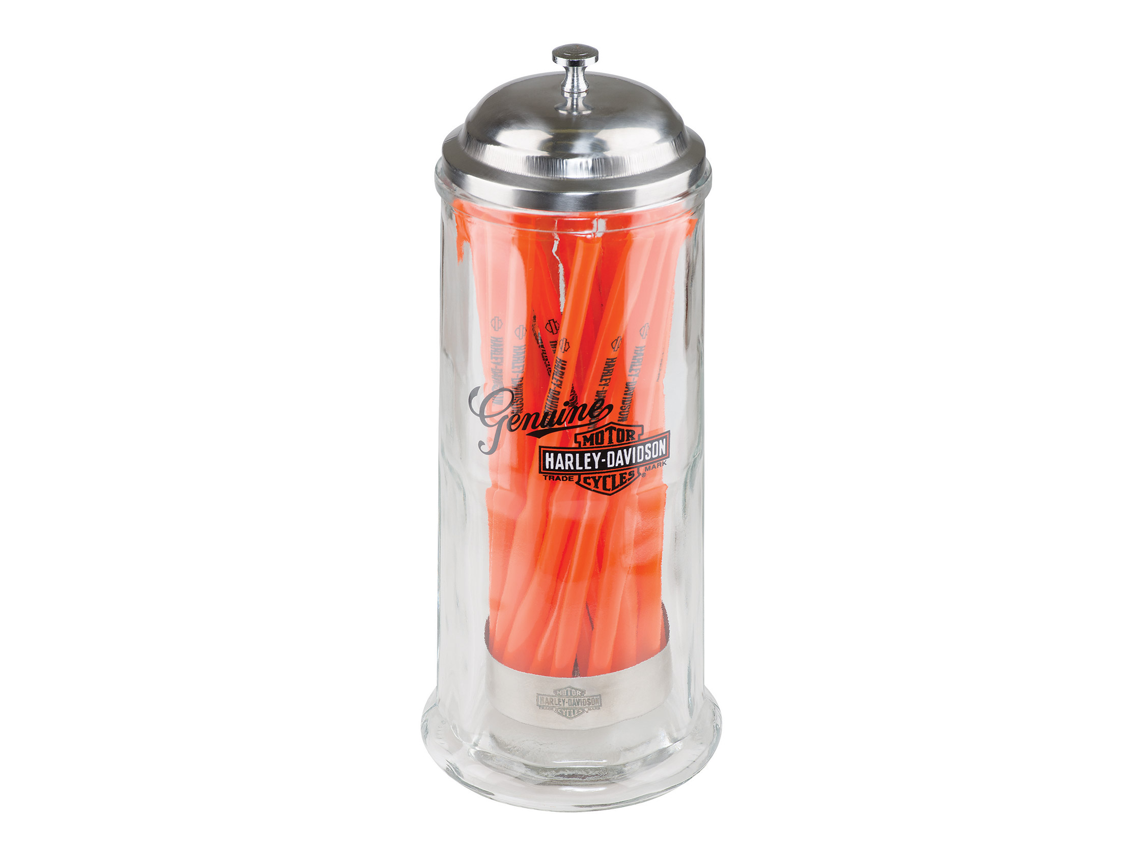 H-D Nostalgic Bar & Shield Straw Dispenser combines classic soda fountain style with Harley® flair. Just lift the top to dispense the straws! Glass dispenser with stainless steel lid features Genuine Harley-Davidson®graphics. H-D Straws included. Refills available - see TRADHDL-18543. Hand wash only. Dimensions: 29 cm x 11 cm diameter