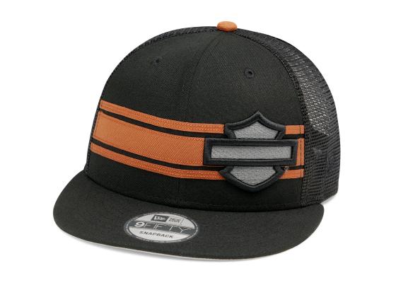 The modern 9FIFTY style of this men's baseball cap features a wide, flat brim and on-trend mesh back. Hearty embroidery of the iconic Bar & Shield logo adds texture and interest while appliqué stripes inject a hit of color. The Stripe & Logo 9FIFTY Cap features an adjustable snap closure for custom fit. Materials: 100% polyester with mesh back. Design Details: Official 9FIFTY silhouette by New Era with visor sticker for authenticity. Flat bill with contrasting underside. Graphics: Appliqué stripes with dimensional embroidered graphics on front. Embroidered New Era flag logo on side.