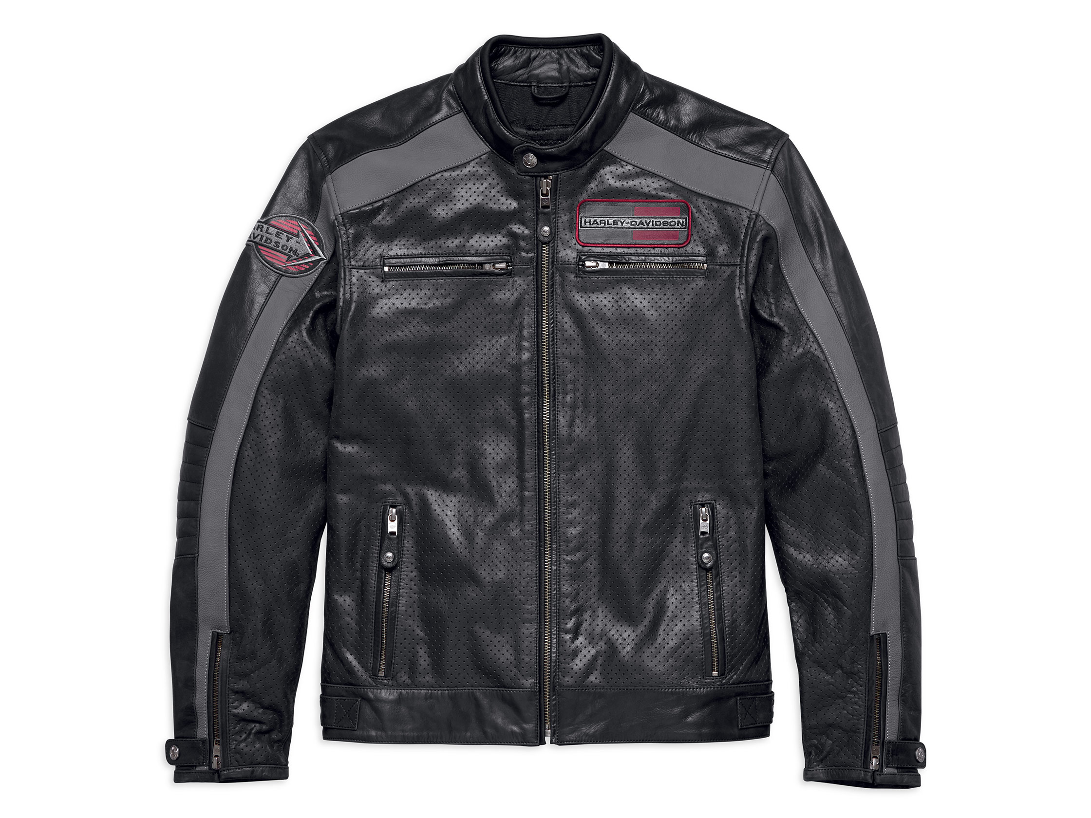 Heavyweight abrasion-resistant buffalo leather with perforated leather panels for airfl ow. Polyester mesh lining. EN 1621-1 CE-approved removable body armor at elbows and shoulders. Back body armor pocket fi ts CE Level 1 Back Armor (98150-17VR, sold separately). Zipper cuffs with snap tabs. Quilted elbows. Slightly pre-curved sleeves. Buckle waist tabs. Two horizontal interior pockets and one zipper vertical interior pocket. Contrasting leather stripes on sleeves. Embroidered and printed leather patches on right sleeve, left chest, and back. Meets or exceeds CE requirements in abrasion resistance, impact testing, and seam bursting for personal protective clothing.