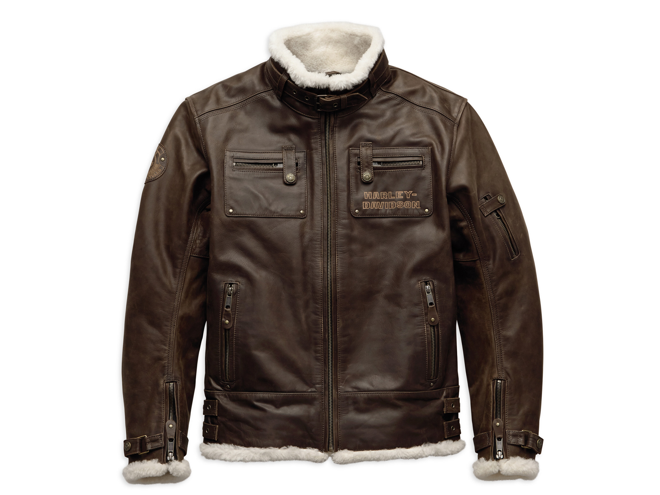 Removable polyester taffeta zip-out full-sleeve quilted liner with two stash pockets. Slim Fit - fits closer to the body. Pre-curved sleeves. Double buckle waist tabs. EN 1621-1 CE-approved removable body armor at elbows and shoulders. Back body armor pocket fits CE Level 1 Back Armor (98150-17VR, sold separately). Mock neck collar with buckle tab. Zipper cuffs with snap tabs. Zipper hand-warmer pockets. Zipper chest pockets with snap tabs. Zipper stash pocket with snap tab on sleeve. Two interior stash pockets and one interior zipper pocket. Laser-etched graphics, leather patch with studs, and leather appliqué graphics. Midweight buffalo leather. Polyester mesh lining. Genuine sherpa trim. Certifications: Meets or exceeds CE requirements in abrasion resistance, impact testing, and seam bursting for personal protective clothing.