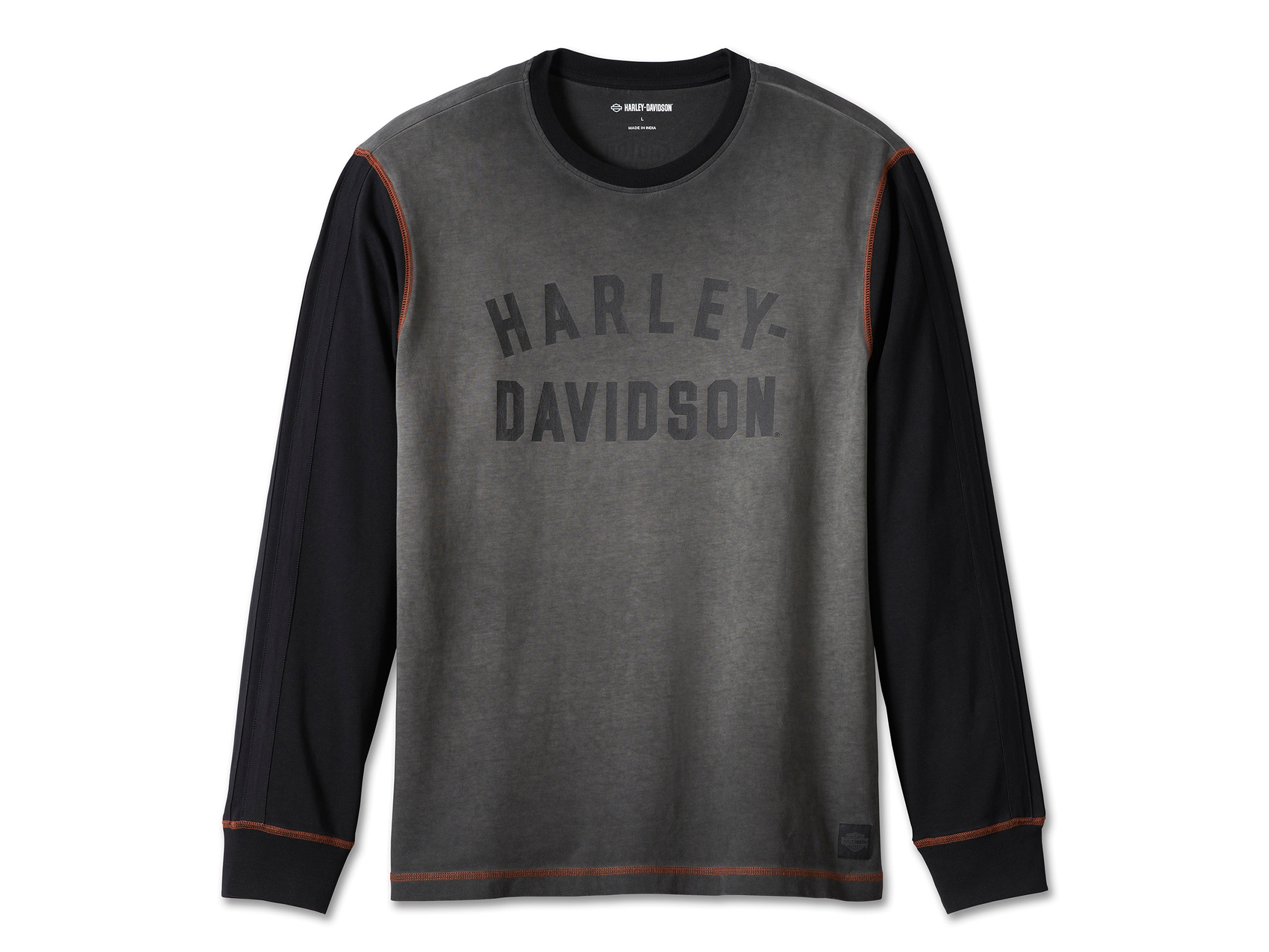 Time-tested style meets longwearing comfort in our Iron Bond Tee—a big reason why we slightly revamped this popular style. Made from cozy cotton jersey, this long sleeve men's t-shirt is specialty washed for a faded appearance and well-worn feel. Features a hit of contrast from its sleeves, neckline, and coverstitching in our iconic orange. Our circa 1930s racer font fills the front, our branded woven label graces the hem, and our beloved Bar & Shield pops off the back.