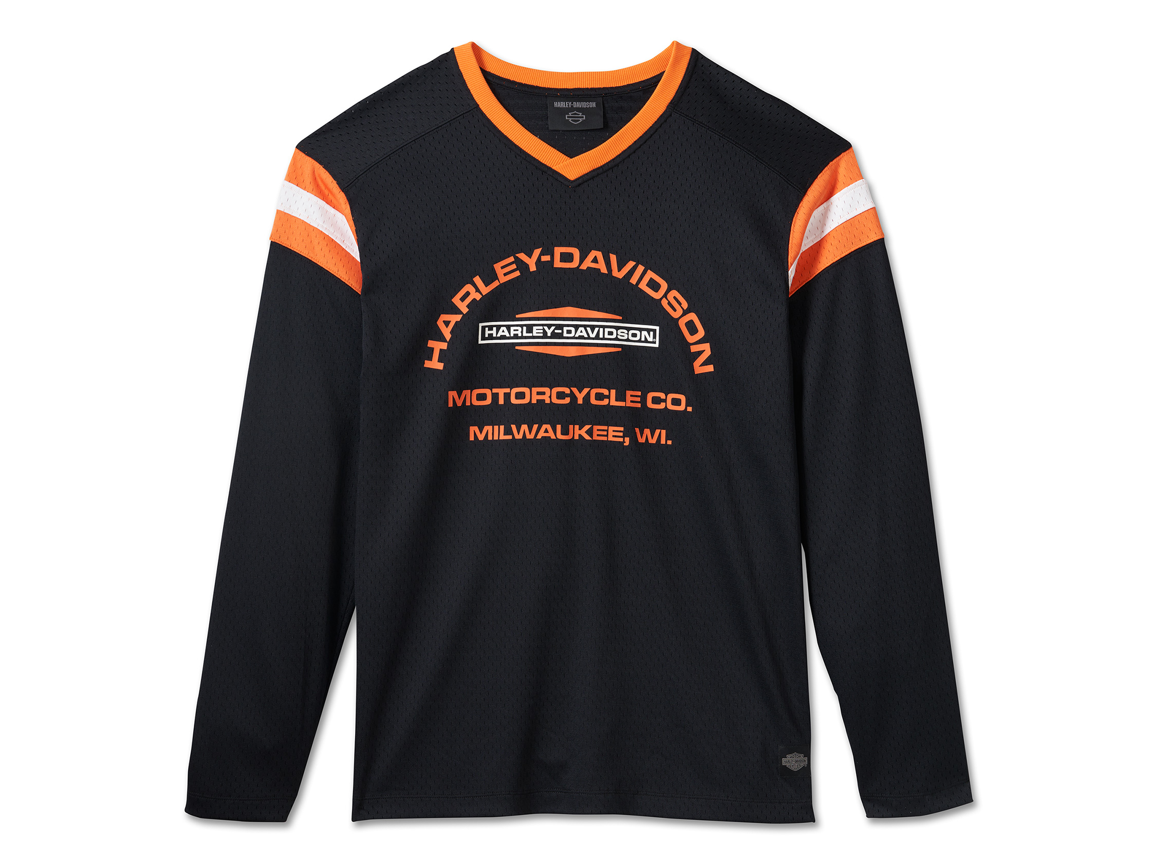 Sporty style shares a lane with longwearing comfort in the Play On Mesh Jersey. Its relaxed fit silhouette is made from heavyweight polyester mesh for breathability. The contrast V-neckline and sleeve piecing complement the bold graphics for a team-inspired look that's 100% Harley-Davidson. Know the history—the "stacked” Bar & Shield here was extended horizontally in 1963 to better fit our motorcycle gas tanks.