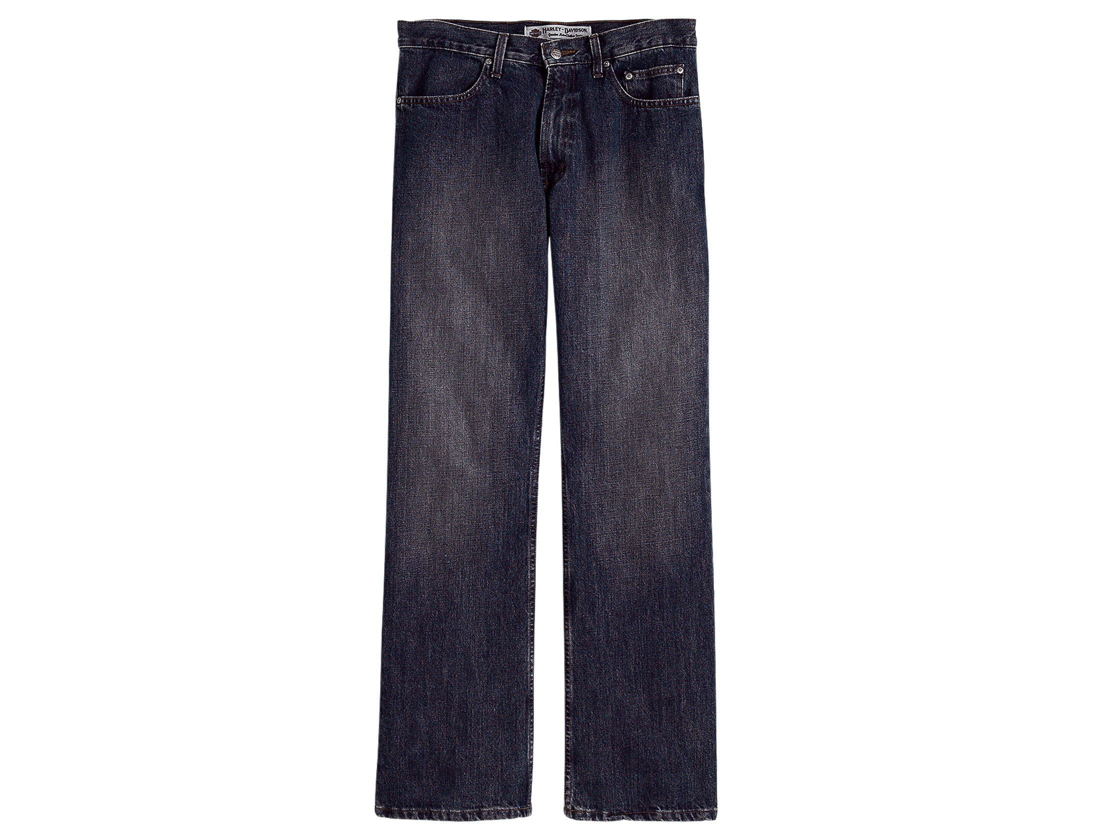 100% 12.75 oz. cotton denim. Classic five-pocket jeans styling. Features a dark slightly tinted wash with distressed sandblasting on thighs. Sits just below the natural waist. Slimmer through seat and thighs. Boot cut leg opening. Unique left side coin pocket for rider convenience. Harley-Davidson® back pocket embroidery. Embossed Bar & Shield logo leather patch on back waist. Available in 30", 32", 34" and 36" inseams.