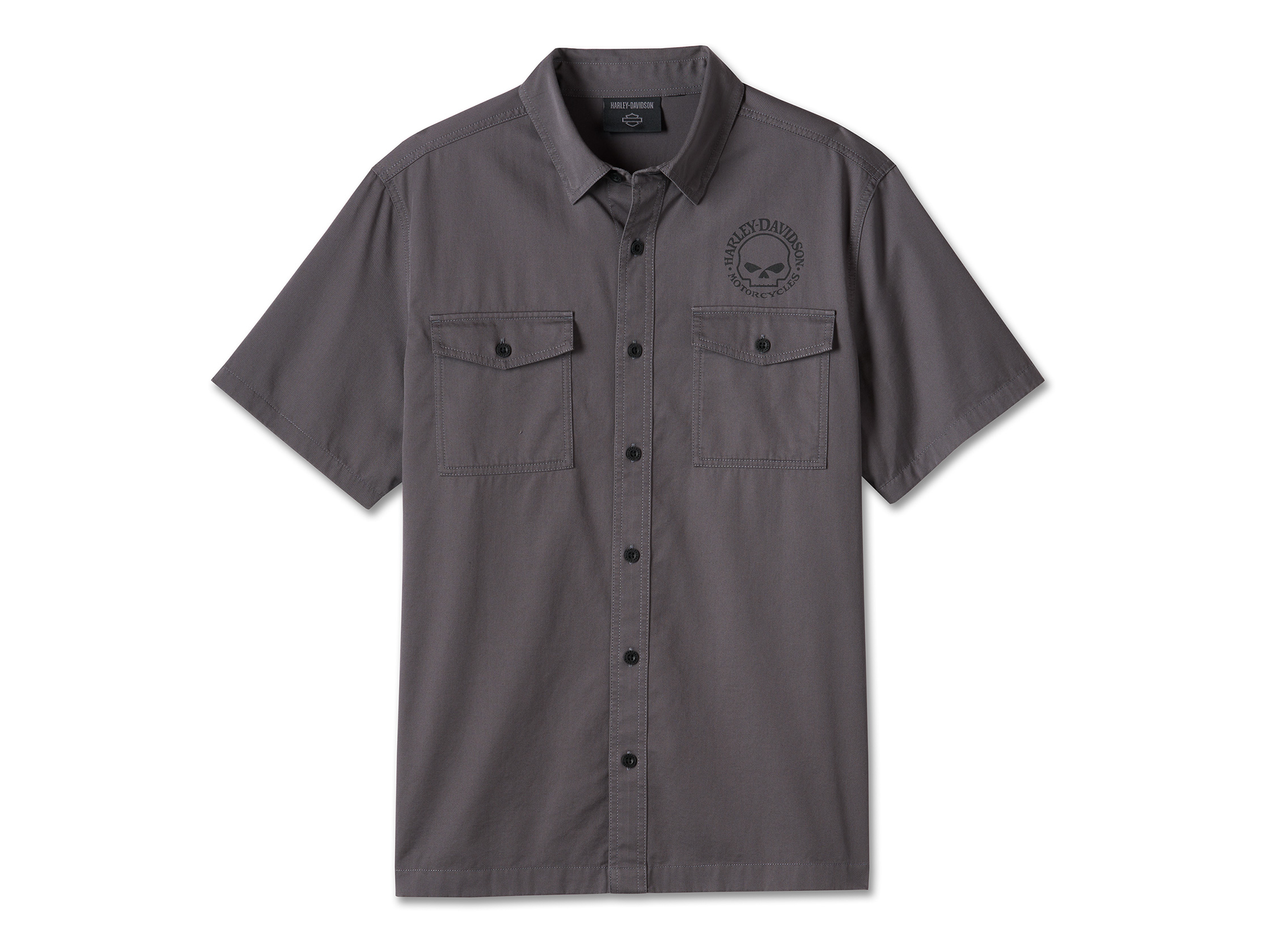 This short sleeve shirt displays the Skull Logo that was originally created by Willie G. Davidson for the 2000 Daytona Bike Week, and has been a rider favorite ever since. Made from 100% cotton twill that's never stiff or constricting because it's pre-washed for a lived-in feel. The Wille G Skull Shirt also features a hidden snap-down collar that won't flap around while you ride.