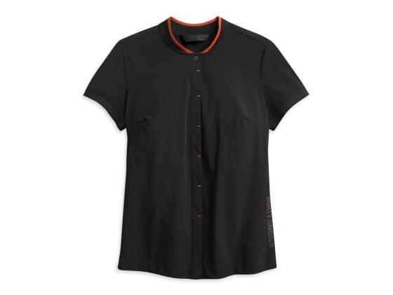 The sporty Collar Accent Shirt features four-way stretch fabrication for maximum comfort and range of motion. Notable accents on this women's short sleeve top: hidden button placket for a sleek line and rib-knit accents that won't restrict at neck or arms Materials: 85% nylon, 15% spandex four-way stretch.