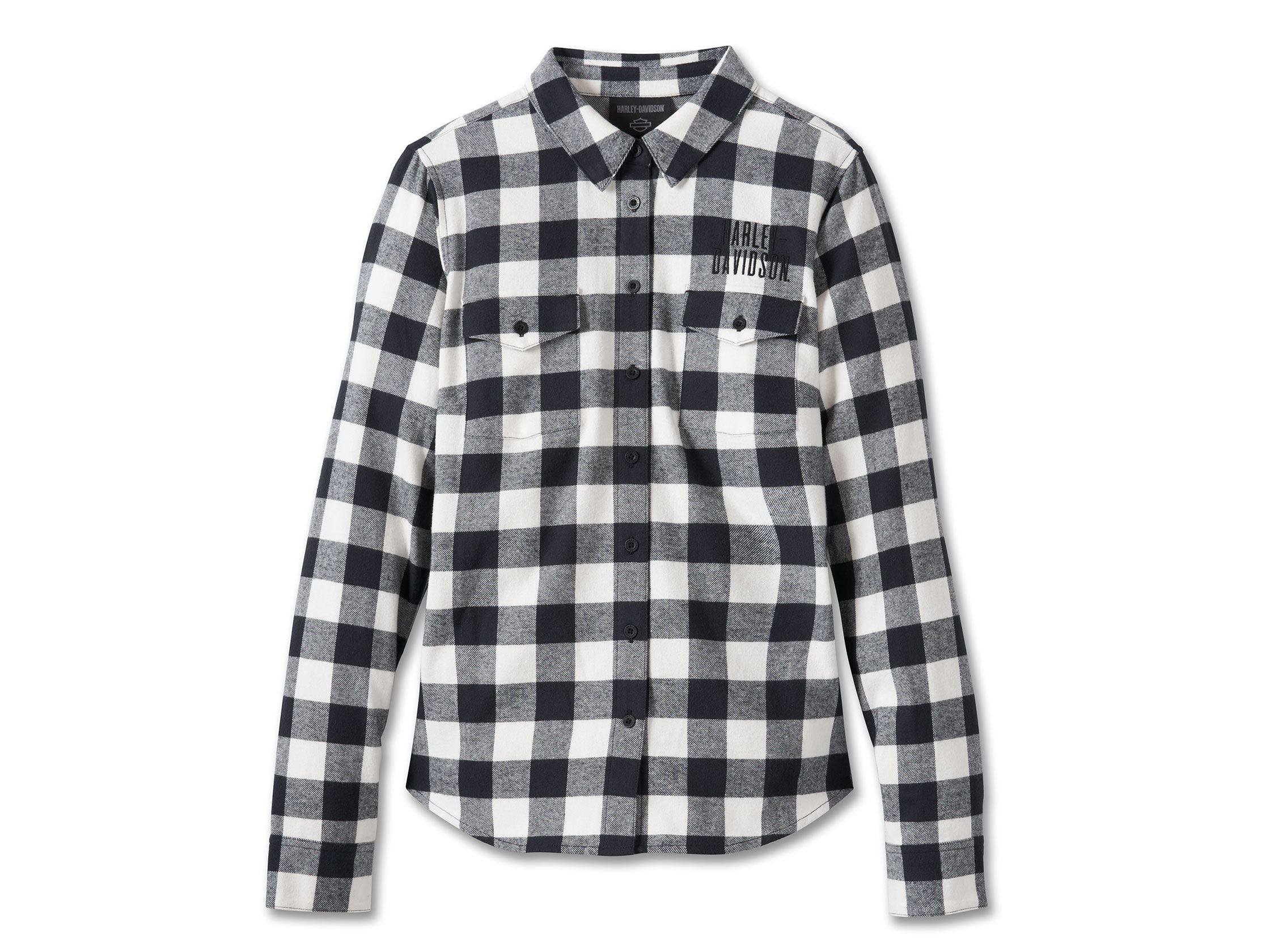 Fall style shares a lane with your favorite motorcycle brand in the Limited Edition Rustic Long Sleeve Flannel Shirt. Made from brushed cotton twill for cozy warmth when temps dip. This women's long sleeve button down shirt features a flattering shirttail hem plus a hidden snap-down collar that won't flap around under your riding gear. Attractive embroidery of seasonal graphics subtle on front and bold on back complete this distinctive Harley-Davidson look. Cart your size now—quantities are limited and selling fast.