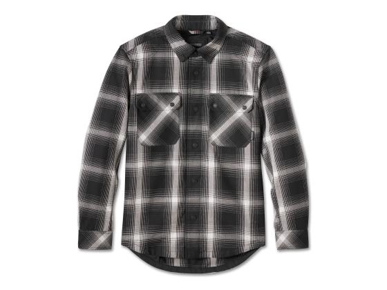 Plaid meets practical riding protection in our Limited-Edition H-D Operative 2.0 Riding Shirt Jacket. Built from heavyweight cotton/poly twill with less lining to feel more like a shirt than a jacket. This men's motorcycle shirt jacket also has underarm venting and reflective material to boost visibility. It's equipped with superior impact protection from our D3O Ghost armor at the shoulders and elbows, and has a hidden snap-down collar that stays in place during rides. We also added a zippered right stash pocket to secure your essentials. This rider favorite has a timeless plaid pattern with minimal branding on front and distinctive Old English style graphics embroidered on back. Get familiar with the specs below, then order yours now before they disappear.