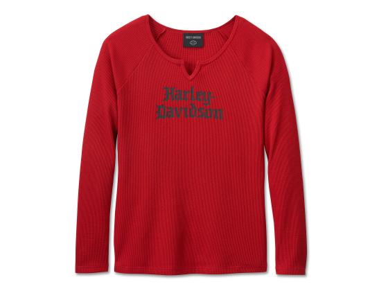 Add more enduring moto style to your wardrobe with our Limited-Edition Harley-Davidson Old English Thermal Top. Crafted from cotton/polyester thermal for longwearing comfort and added texture (zoom in to see). This women's long sleeve waffle top sports a flattering notched neckline and raglan sleeves for an elevated look. The back stays clean while the front is classically finished with our namesake in Old English lettering. Order ASAP before they're gone.