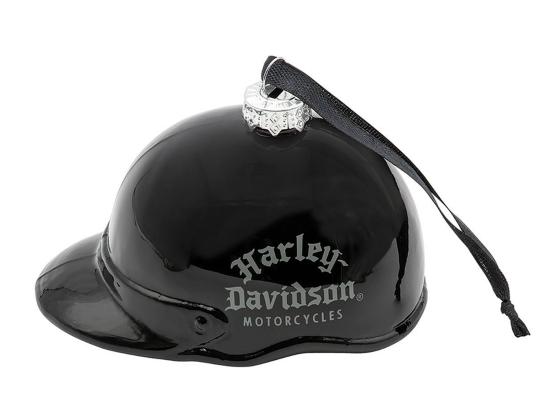 Blown glass helmet ornament with decal Old English Harley-Davidson logo. Dimensions: 10 x 8 x 6 cm.