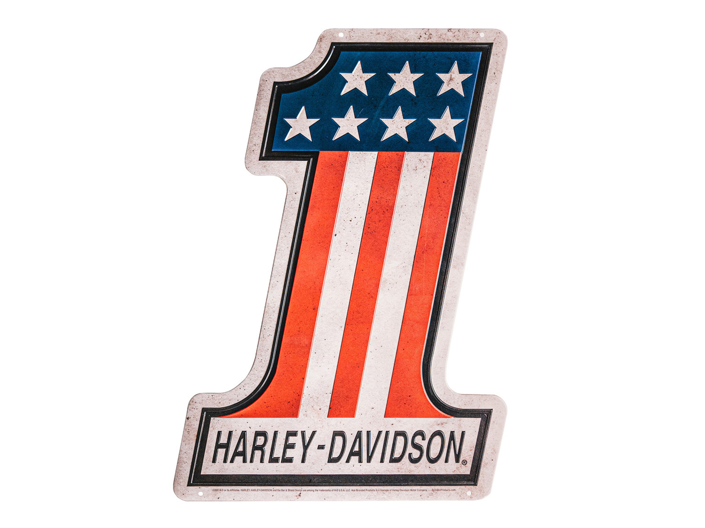 Classic Harley-Davidson #1 logo reproduced as a tin sign. Embossed accents and vibrant colors add depth and dimension to your favorite logo. Smooth edges for safe handling. Includes holes for easy hanging. Dimensions: 46 x 32 cm