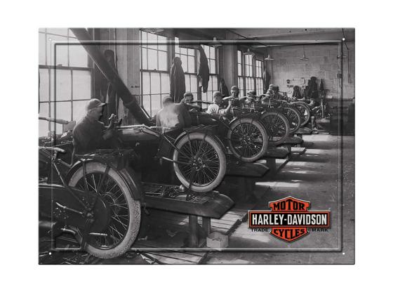 Nostalgic H-D Factory photo reproduced as a tin sign. Embossed accents and rich colors add depth and dimension. Smooth edges for safe handling. Includes holes for easy hanging. Dimensions: 40 x 30 cm