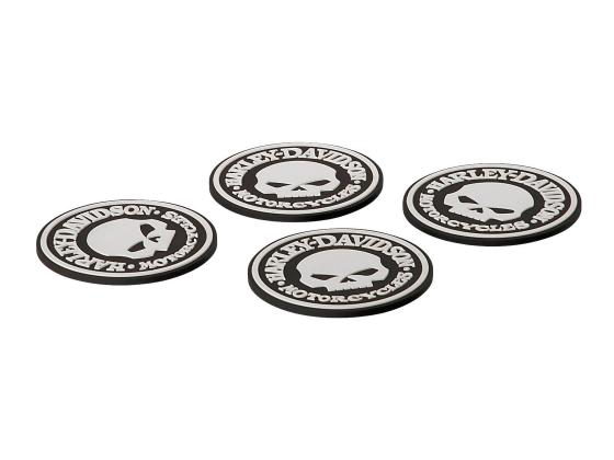 H-D® Skull Coasters act like mini beverage mats for your glass. No-slip, contoured rubber construction protects surfaces from drips and spills. Set includes 4 rubber coasters. Dimensions: Diameter 10.16 cm