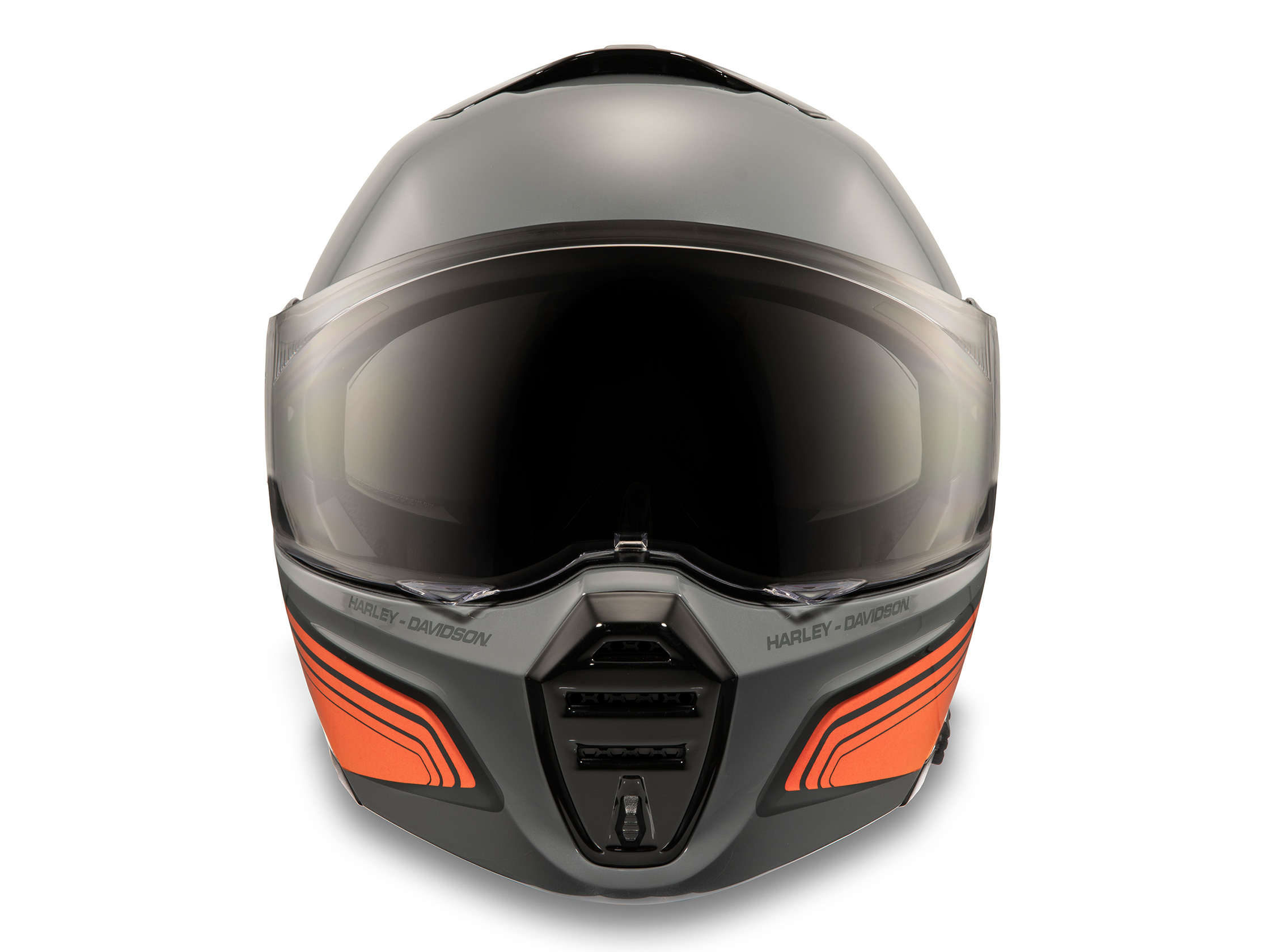 Superior ventilation, sun protection, and wearable versatility—this latest helmet checks those three boxes and more. Engineered with pregnated fiberglass, our Limited Edition H-D® Evo X17 Sunshield Modular Helmet is loaded with features like adjustable vents (at chin, top, and back spoiler), UVA/UVB protection on the sunshield and face shield, and a fully removable chin bar to transform from a modular to ¾ open-face configuration. Also has a tool-free ratchet system that properly seals your shield with an elliptical motion, and a moisture-wicking liner that's easy to remove and wash. Its striking design is finished with striping and branding in our iconic colors. School yourself on the rest of its specs below, then order soon since it's a limited quantity offering.