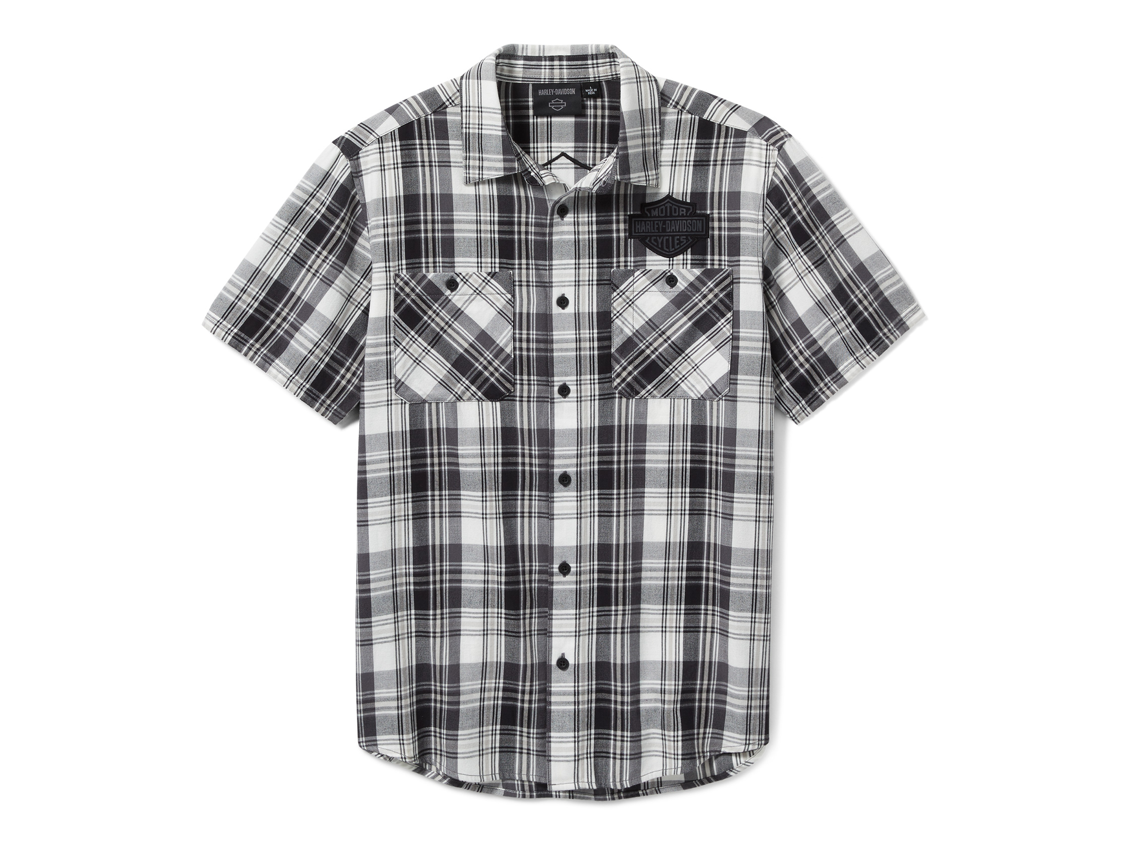Timeless moto style is a no-brainer in our Bar & Shield Plaid Shirt. It's built for lightweight, longwearing comfort from breathable yet durable all-cotton twill that's washed for softness. This short sleeve men's button down features a pen stall and a hidden snap-down collar that won't flap around under riding gear. It's finished with a patch of our most iconic graphic perched on front and parked on back.