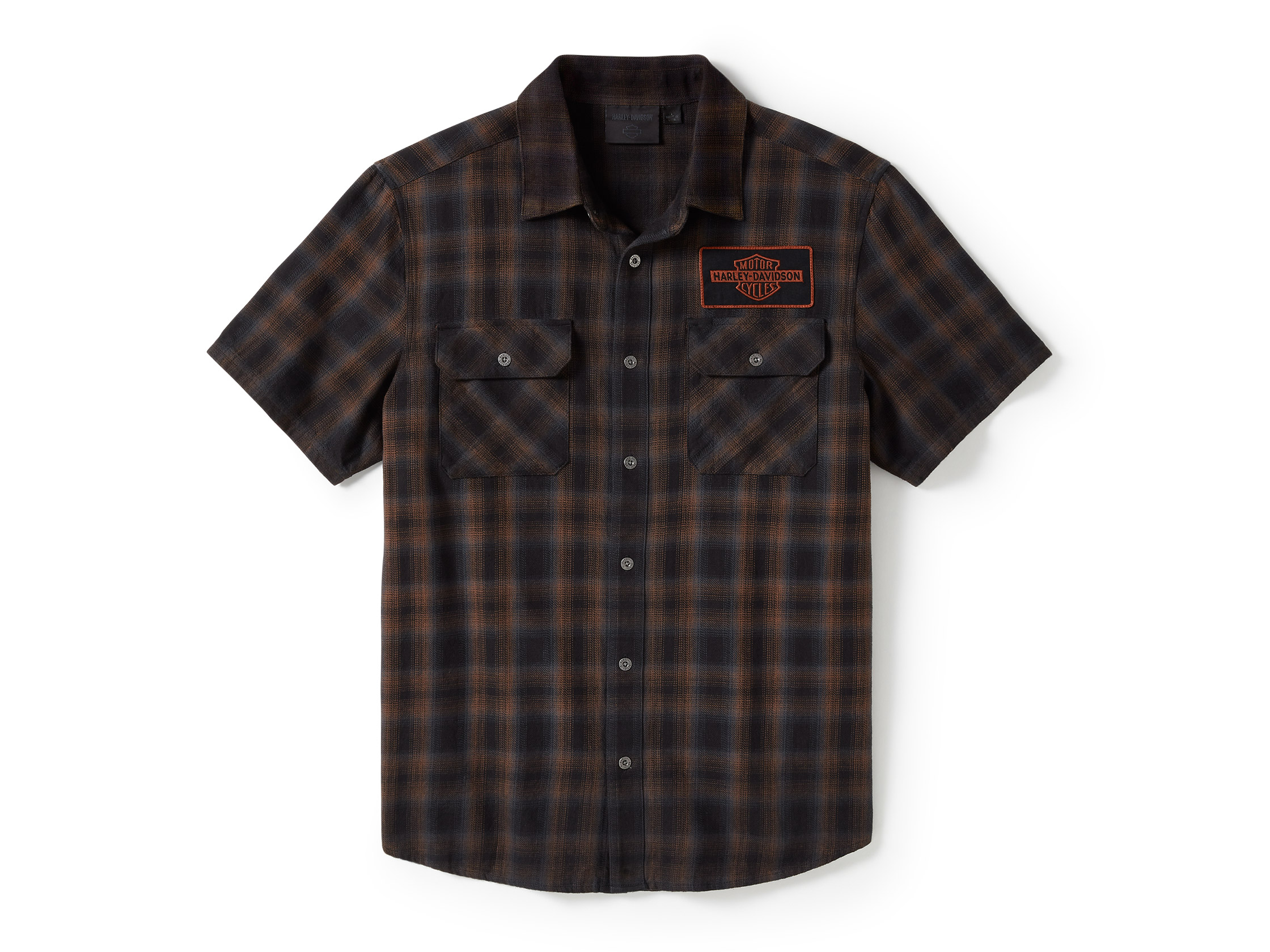 Classic moto style is here on our Bar & Shield Plaid Short Sleeve Shirt. Made for breathable comfort from all-cotton poplin that's vintage washed for a well-worn vibe. This men's button down features a pen stall and a hidden snap-down collar that stays put under riding gear. Finished with a replica of our 1930s Bar & Shield patched on front and printed on back.