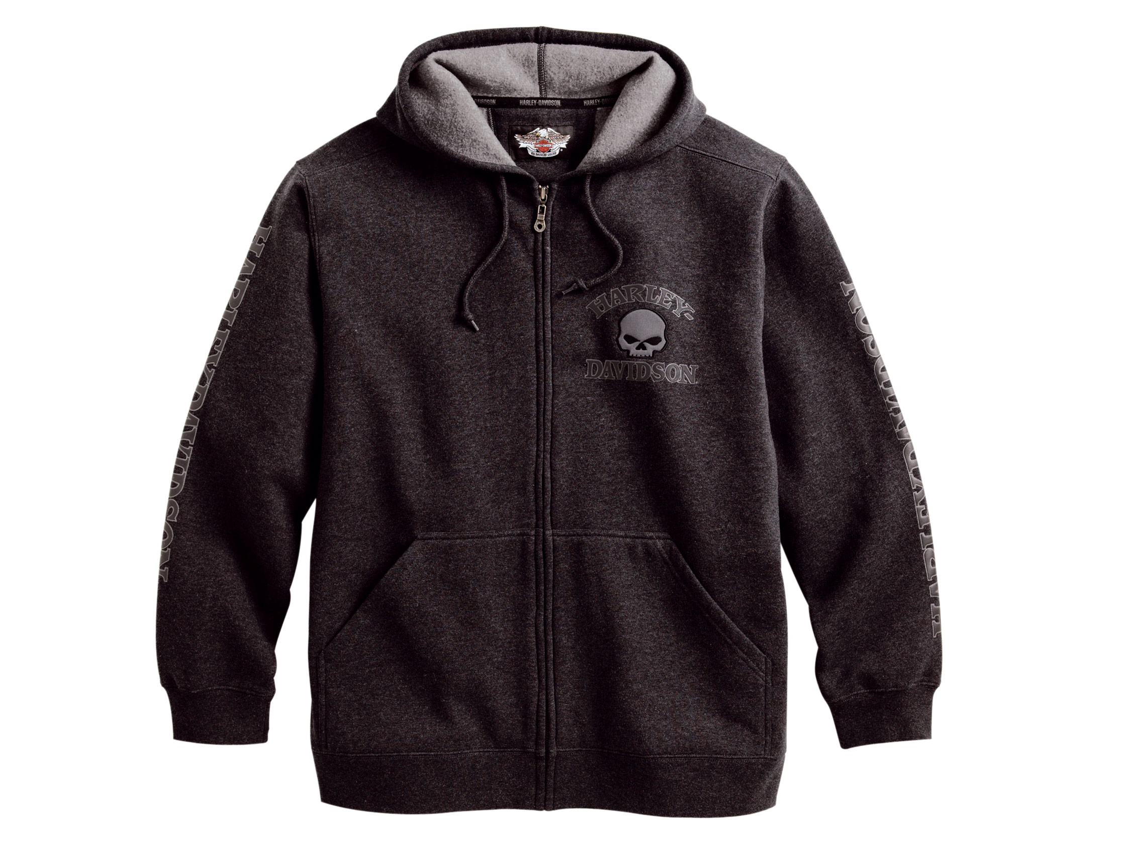 Zipper front with drawstring hood and two kangaroo-style hand-warmer pockets. Dimensional printed graphics on sleeves, left chest, and back. Appliqué and embroidered skull graphic on left chest and back. 60% cotton, 40% polyester fleece.