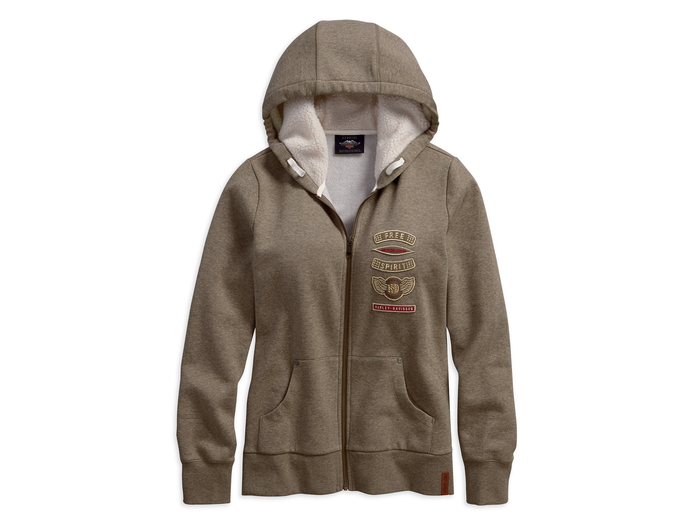 This heathered women's hoodie is lined with toasty Sherpa fleece for the feel of a cozy blanket wrapped around you. Studded patches embroidered with metallic floss add a refined accent to this cold-weather Sherpa Fleece Lined Hoodie. Materials: 70% cotton, 30% polyester fleece. 100% polyester Sherpa fleece hood lining.