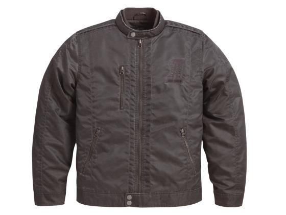 100% nylon with poly-mesh lining. Snap-tab mandarin collar. Zipper front with waist snap. Zipper cuffs. Two zipper-hand-warmer pockets, one zipper chest pocket, and two interior pockets. Distressed wash for a vintage look. Embroidered graphics on left chest.