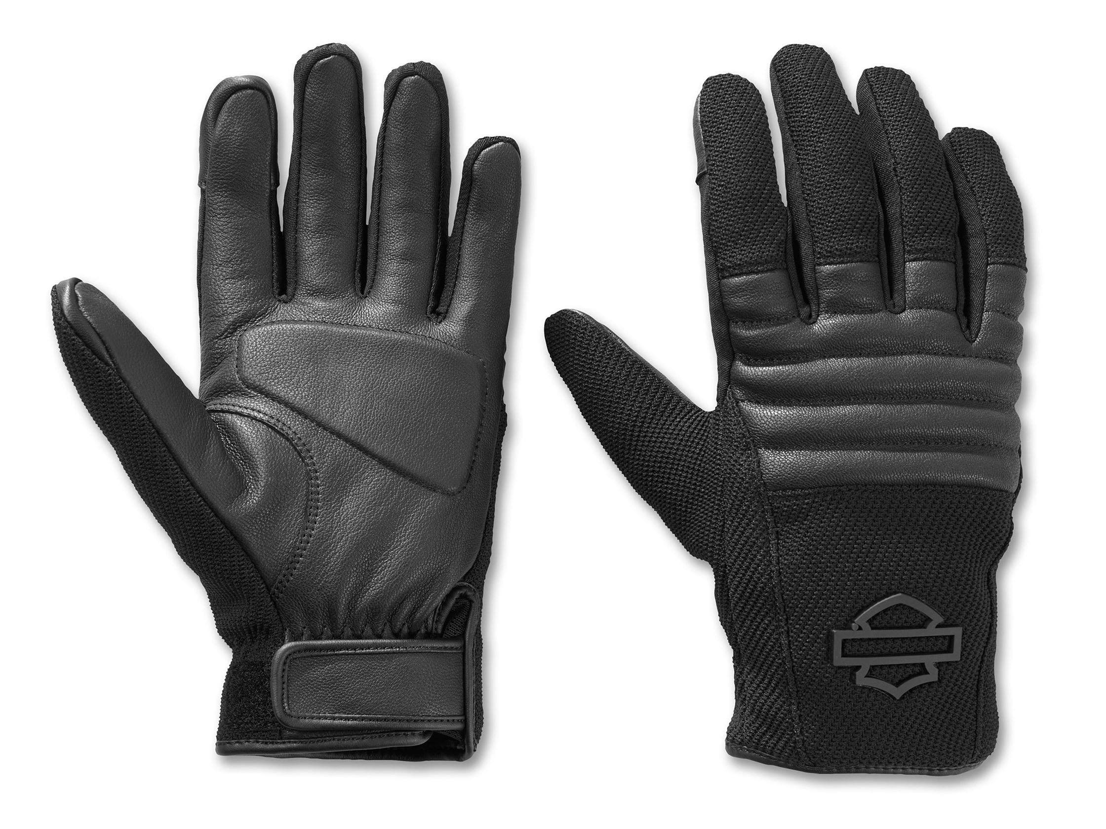 Go the distance comfortably in our H-D Dyna Knit Leather Riding Gloves. Built from a wise blend of goatskin leather and polyester interlock dyna knit for a move-with-you grip. Features D3O Ghost armor at the knuckles for weightless impact protection, a padded palm to minimize road rattle, and touchscreen-compatibility. These men's motorcycle gloves are monochromatic and minimally branded to style well with your other riding gear.