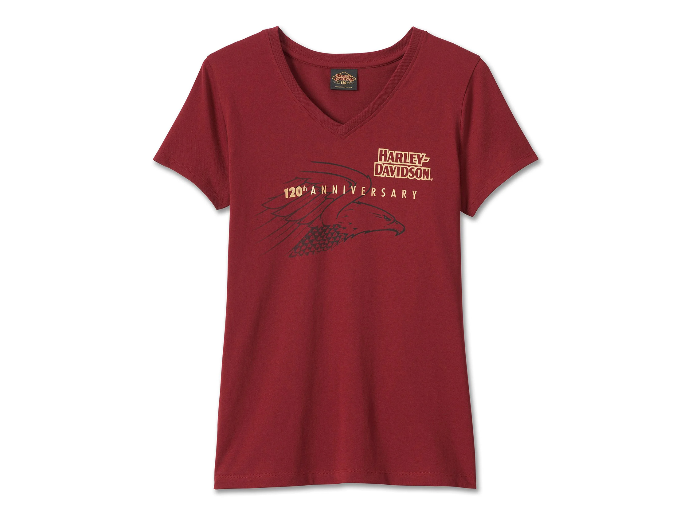 Let your love for style soar in our 120th Anniversary United V-Neck Tee. Made from breathable + soft cotton jersey with a flattering V-neckline that's also rib knit to help keep its shape. We kept the back clean so that our custom 120th Anniversary front graphics could get all the attention. Between the metallic ink and our swooping Eagle, it's a make-a-statement look that's unmistakably Harley-Davidson.
