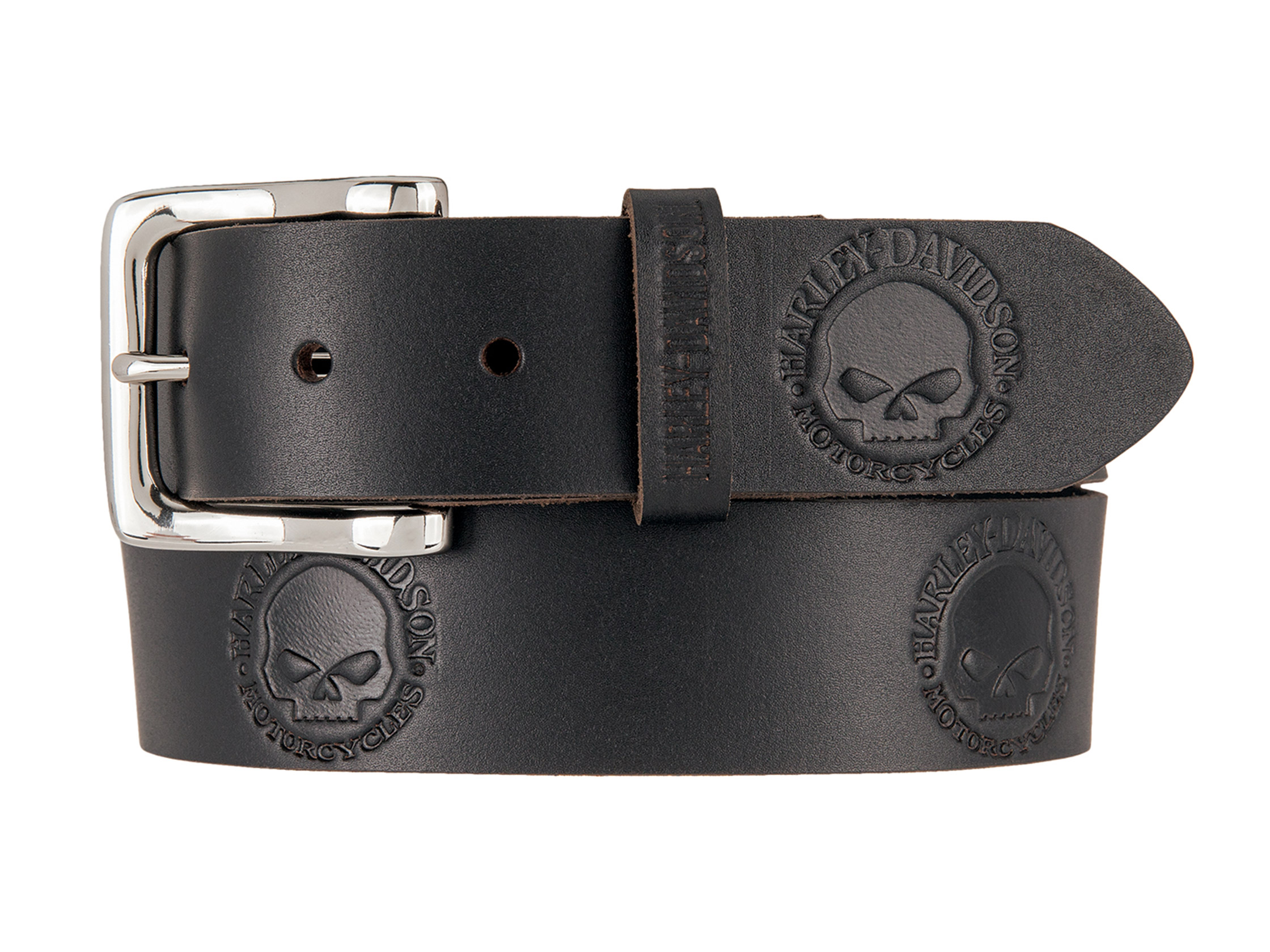 Harley-Davidson Willie G World Ledergürtel für Männer. Wenn es um Mode geht, zieht manchmal das Understatement die ganze Aufmerksamkeit auf sich. Hier wird die Verzierung auf ein Minimum beschränkt: Nur der Willie G Skull. Das Totenkopf-Logo ist ein Klassiker und ist an verschiedenen Stellen um den Gürtel herum geprägt. Der Gürtel besteht aus echtem Leder mit glatter Oberfläche und ist mit einer traditionell gestylten Schnalle mit glänzender Nickeloberfläche ausgestattet. Die Schnalle ist austauschbar, so dass sie je nach Lust und Laune gegen eine andere Harley-Schnalle ausgetauscht werden kann.