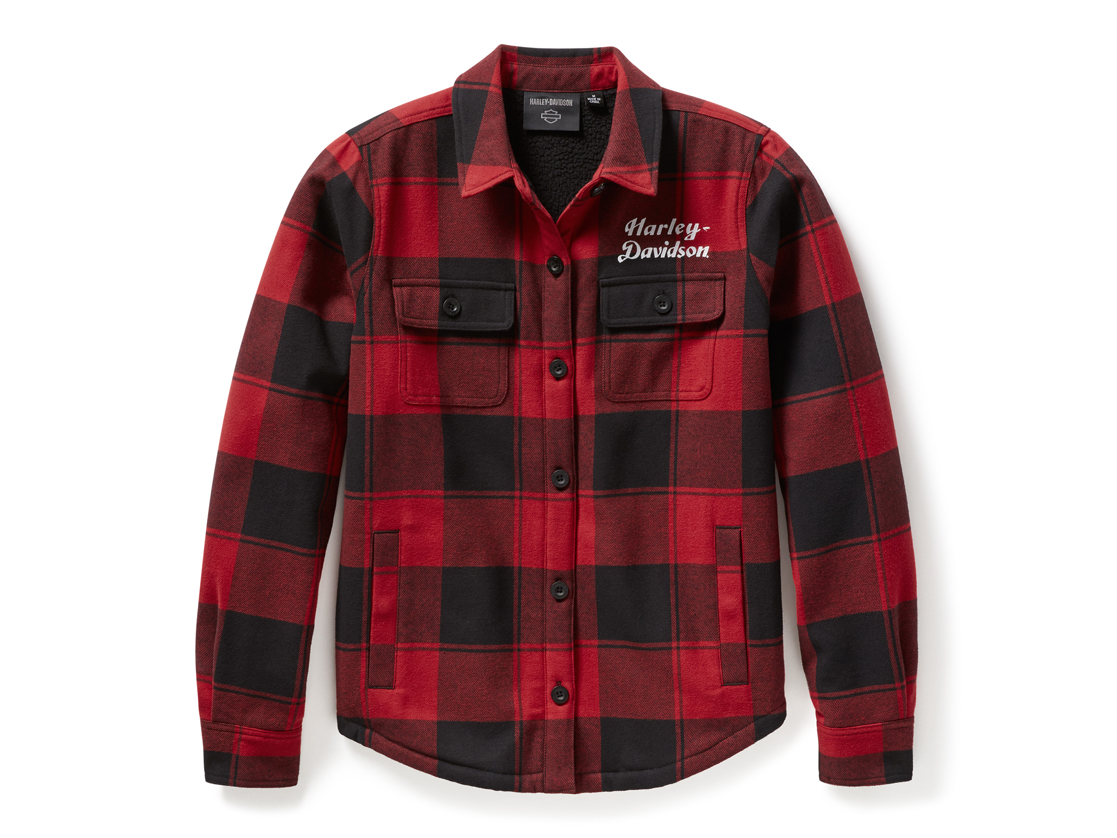 Mit unserer H-D Buffalo Check Hemdjacke bleibst Du auch bei kaltem Wetter warm, ohne Abstriche beim Stil machen zu müssen. Diese strapazierfähige äußere Schicht für Damen ist aus schwerem Baumwoll-Twill gefertigt und verfügt über ein kuscheliges Sherpa-Futter aus Polyester. Mit viel Platz in den Taschen für Deine wichtigsten Dinge und einem Kragen, der dank versteckter Druckknöpfe beim Fahren unter der Motorradbekleidung an seinem Platz bleibt. Das klassische Büffelkaro-Muster bildet den perfekten Hintergrund für unsere Motive, die die Vorderseite zieren und die Rückseite ausfüllen.