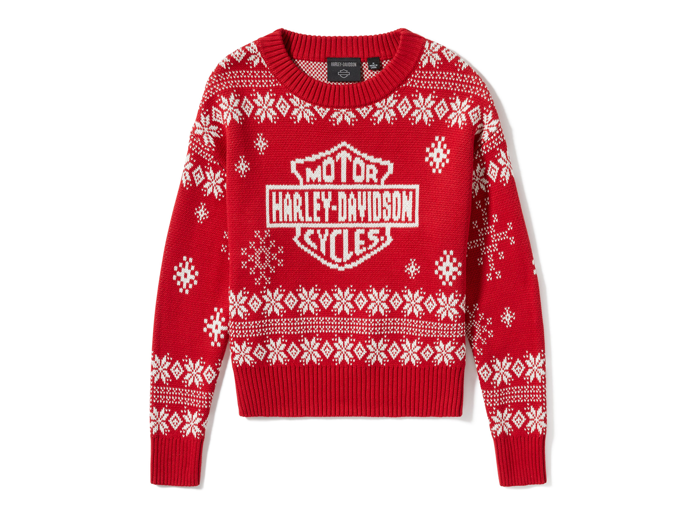 Verleihe Deinem Weihnachtslook mit unserem Limited Edition Harley® Holiday Sweater das gewisse Etwas. Er ist aus natürlichem Baumwollgarn gestrickt und bietet atmungsaktiven, langanhaltenden Tragekomfort. Dieser Damenpullover mit Rundhalsausschnitt besitzt einen Rippstrick-Saum, um die Form zu halten. Mit auffälligen Allover-Motiven, die die Bergwelt mit Moto-Elementen kombinieren. Schnapp Dir Dein Exemplar jetzt, bevor alle weg sind.