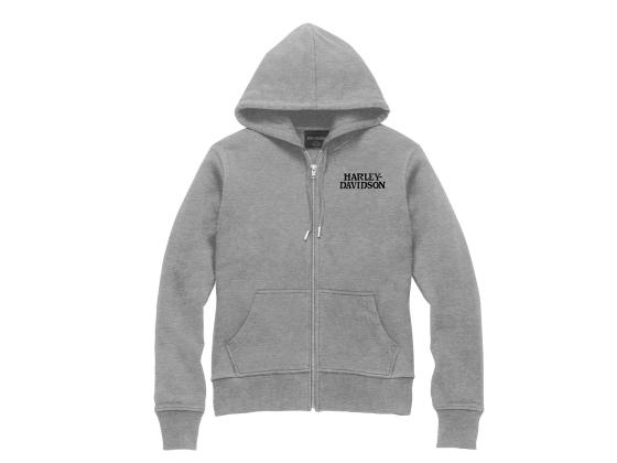 Wenn Du auf der Suche nach dem Ultracoolness-Faktor bei Harley-Davidson Bekleidung bist, liegst Du mit dem Special Skull Zip Front Hoodie genau richtig. Dieses Damen-Hoodie aus einer Fleece-Mischung aus Baumwolle und Polyester präsentiert unser legendäres Skull Motiv in Übergröße auf dem Rücken, damit Du immer einen bleibenden Eindruck hinterlässt.