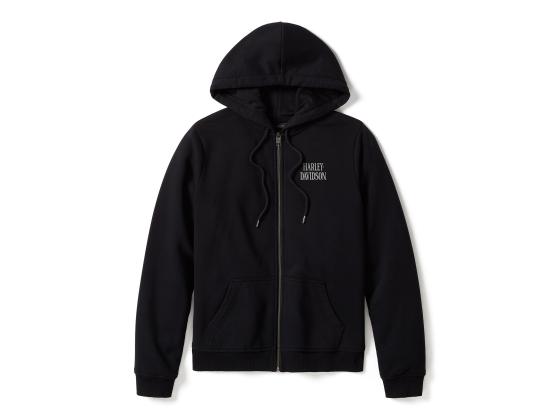 Mit dem Willie G" Skull Full Zip Hoodie huldigt Dein Look einem kreativen Vermächtnis. Dieses Damen-Sweatshirt mit Kapuze und Reißverschluss ist in entspannter Passform aus Fleece aus Baumwolle und Polyester gefertigt und bietet langanhaltenden Tragekomfort. Die mit Jersey gefütterte Kapuze hat zwei praktische Öffnungen, um den Kordelzug zu verstauen, damit er beim Fahren nicht herumflattert. Das Branding auf der Vorderseite ist minimal, damit das unerschrockene Willie G Skull Motiv auf dem Rücken die ihm gebührende Aufmerksamkeit bekommt. Obwohl der Skull eine seiner bekanntesten Kreationen ist, hat Willie G. Davidson auch mehrere Motorräder entworfen, darunter die 1971er FX Super Glide® und die 1977er FXS Low Rider®.