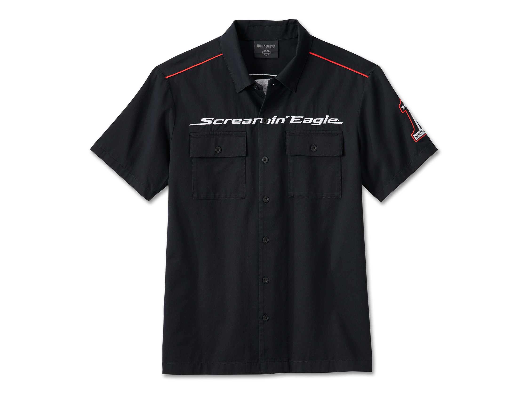 Das Screamin' Eagle Short Sleeve Shirt ist eine Neuinterpretation des lässigen Styles speziell für Fans von Bagger Performance. Es ist in entspannter Passform aus Twill aus Baumwolle gefertigt, der weich gewaschen wurde, damit er sich wie eingetragen anfühlt. Dieses kurzärmelige Button-Down-Hemd für Herren verfügt über eine Schulterpaspelierung, Belüftungsöffnungen an den Seitennähten und einen Kragen, der dank versteckter Druckknöpfe beim Fahren unter Deiner Motorradbekleidung an seinem Platz bleibt. Mit einem mix auffälliger, vom Rennsport inspirierter Stickmotive. Tatsächlich huldigt der hintere Kragen unserem Road Glide 131R Bagger Race Bike.