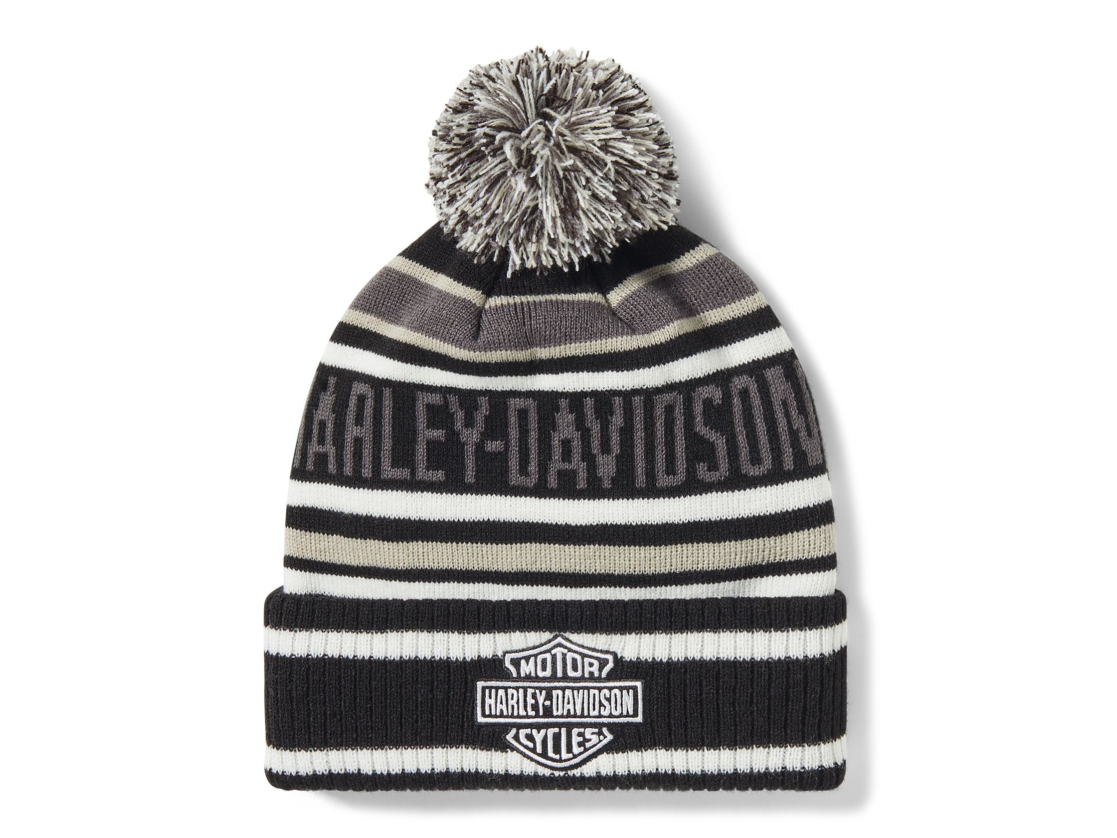Unsere Harley-Davidson Stripe Pom Beanie steht ganz im Zeichen auffälligen, warmen Stils. Sie ist aus reinem Acryl gefertigt und bietet langanhaltenden Tragekomfort, ohne zu kratzen wie Wolle. Dieses Unisex-Accessoire ist mit einem mehrfarbigen Strickbommel, speziellen Allover-Motiven und Streifen sowie einem gestickten Patch für zusätzliche Dimension versehen.