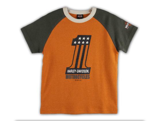Harley-Davidson Kinder T-Shirt "#1 Motorcycles". Rrobustes und elastisches Baumwoll/Polyester-Gemisch. Raglan-Ärmel und etwas Stretch verbessern die Bewegungsfreiheit.#