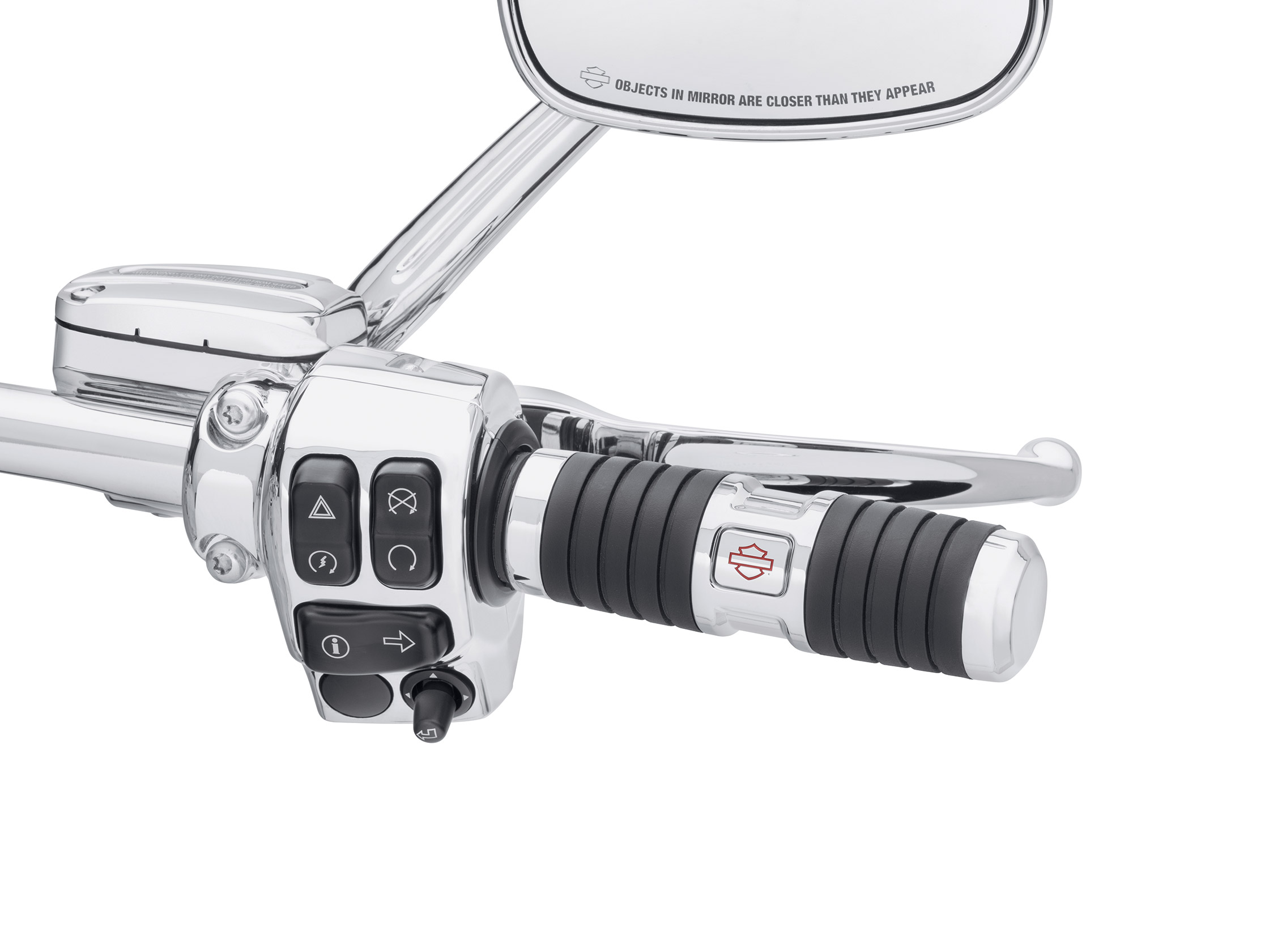 Unaufdringlich, aber kraftvoll, punkten die Bedienelemente der Kahuna Kollektion mit einer spiegelgleichen Chromoberfläche, umgeben von tiefschwarzem, rutschfestem Gummi. Die Chrom-Bedienelemente sind passend zu anderem Zubehör der Kahuna Kollektion gestylt, und die Lenkergriffe und Fahrertrittbretter ziert ein Bar & Shield® Logo in sattem Rot.