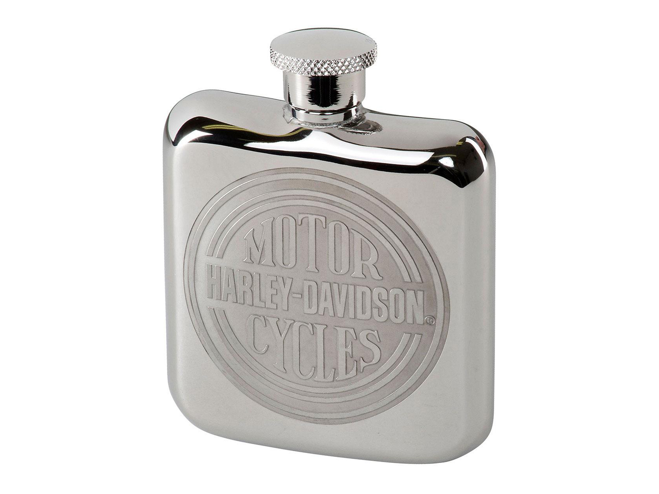 4 oz. / 120 ml Flachmann aus Edelstahl. Eingraviertes Harley-Davidson Circle Logo auf der Vorderseite. Abmessungen: 10 x 2 x 11 cm