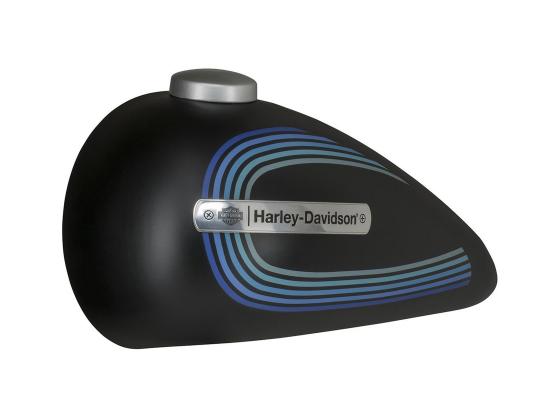 Modell eines Benzintanks aus Metall mit Tankgrafik und Emblem von 2018. Abmessungen: 52 x 25 x 18 cm