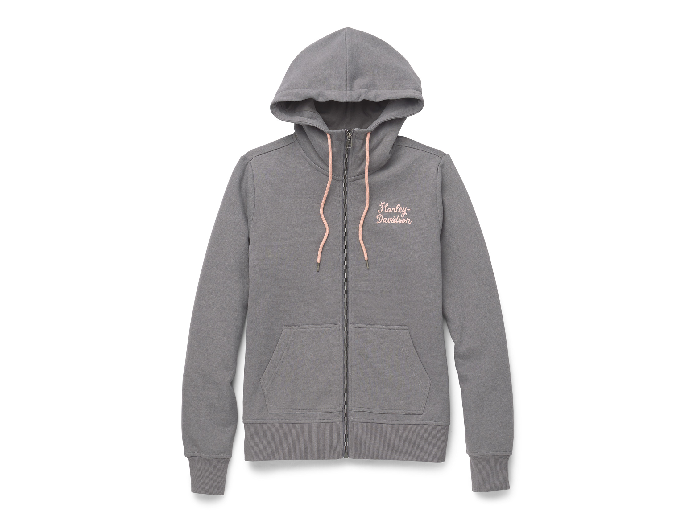 Bei unserem Salute Solid Zip Front Hoodie trifft Vielseitigkeit auf Komfort mit einem Hauch von Glitzer und Pink. Dieses Hoodie aus Fleece aus Baumwolle und Polyester bietet den ganzen Tag über ein kuscheliges Tragegefühl und ist mit einem höheren Halsabschluss und Kängurutaschen mit gewölbten Nietenverzierungen versehen. Außerdem ist es einzigartig gestaltet mit unserem Logoschriftzug und einem Motiv, das von unserem Silver Wing Aufnäher aus den 1930er Jahren inspiriert ist. Der zeitlose Stil dieses Hoodies lässt sich gut mit vielen Tanktops und T-Shirts von H-D® in Deinem Kleiderschrank kombinieren.