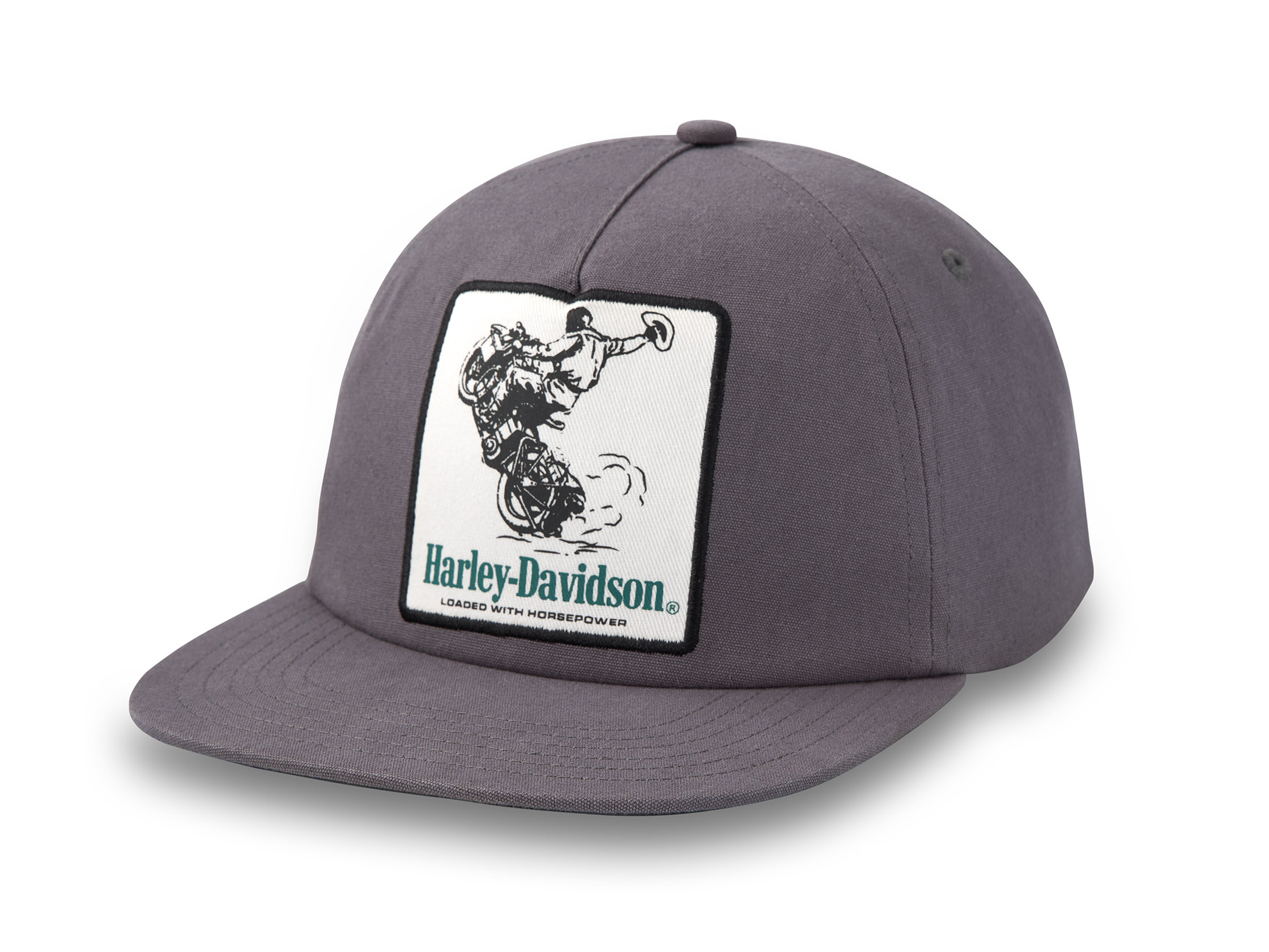 Unsere Limited Edition Cowboy 5-Panel Strapback Cap bietet Harley® Fans ein Retro-Fit im Western-Stil. Sie ist aus robustem und dennoch atmungsaktivem Canvas aus Baumwolle gefertigt und verfügt über ein kühlendes Schweißband sowie einen einstellbaren Metallschieber mit Branding für lang anhaltenden Tragekomfort. Der gehobene Look entsteht durch Details wie die kontrastierende Schirmunterseite und das spezielle Motiv. Tatsächlich stammt der PS-Spruch auf dem vorderen Twill-Aufnäher von Hemden aus den 1970er Jahren in unseren Archiven. Schnapp Dir Dein Exemplar, solange der Vorrat reicht.