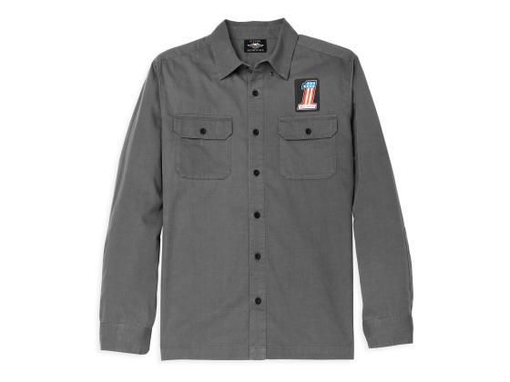 Harley-Davidson Hemd Block Font Solid Mechanics für Herren. Ein limitiertes Langarmhemd für den optimalen Lagenlook. Es ist aus robustem Twill aus 100 % Baumwolle gefertigt und bietet mit seiner Mechaniker-Passform Platz, etwas drunterzuziehen. Mit Knöpfen mit Branding an den Taschenklappen, vorn und an den Bündchen sowie einem Kragen mit versteckten Druckknöpfen, der beim Fahren an seinem Platz bleibt. Für die Krönung sorgen eine Filzapplikation unseres legendären #1 Logos und unser Logoschriftzug, der groß auf die Rückenpasse gestickt ist.