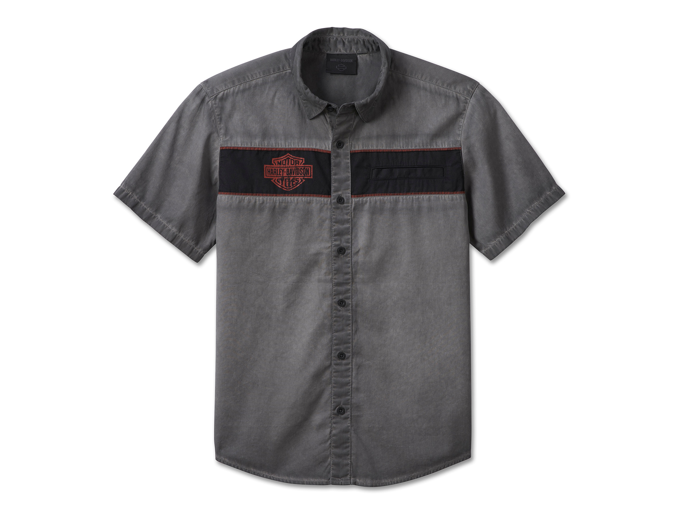 Arbeiten, Fahren, Feiern, Entspannen - all das sind geeignete Szenarien für unser Iron Bond Shirt. Diese aktualisierte Neuauflage eines Bestsellers bietet dauerhaften Komfort aus robustem Twill aus Baumwolle, der durch spezielle Waschbehandlung ein verblasstes Aussehen erhält und sich gut getragen anfühlt. Dieses kurzärmelige Herrenhemd setzt mit seinen Einsätzen und der Paspelierung einen kontrastreichen Akzent und ist mit seinem Kragen, der dank versteckter Druckknöpfe beim Fahren an seinem Platz bleibt, besonders praktisch. Unser heißgeliebtes Bar & Shield in einem knalligen Orange auf der Brust sorgt für einen authentischen Harley-Davidson Look.