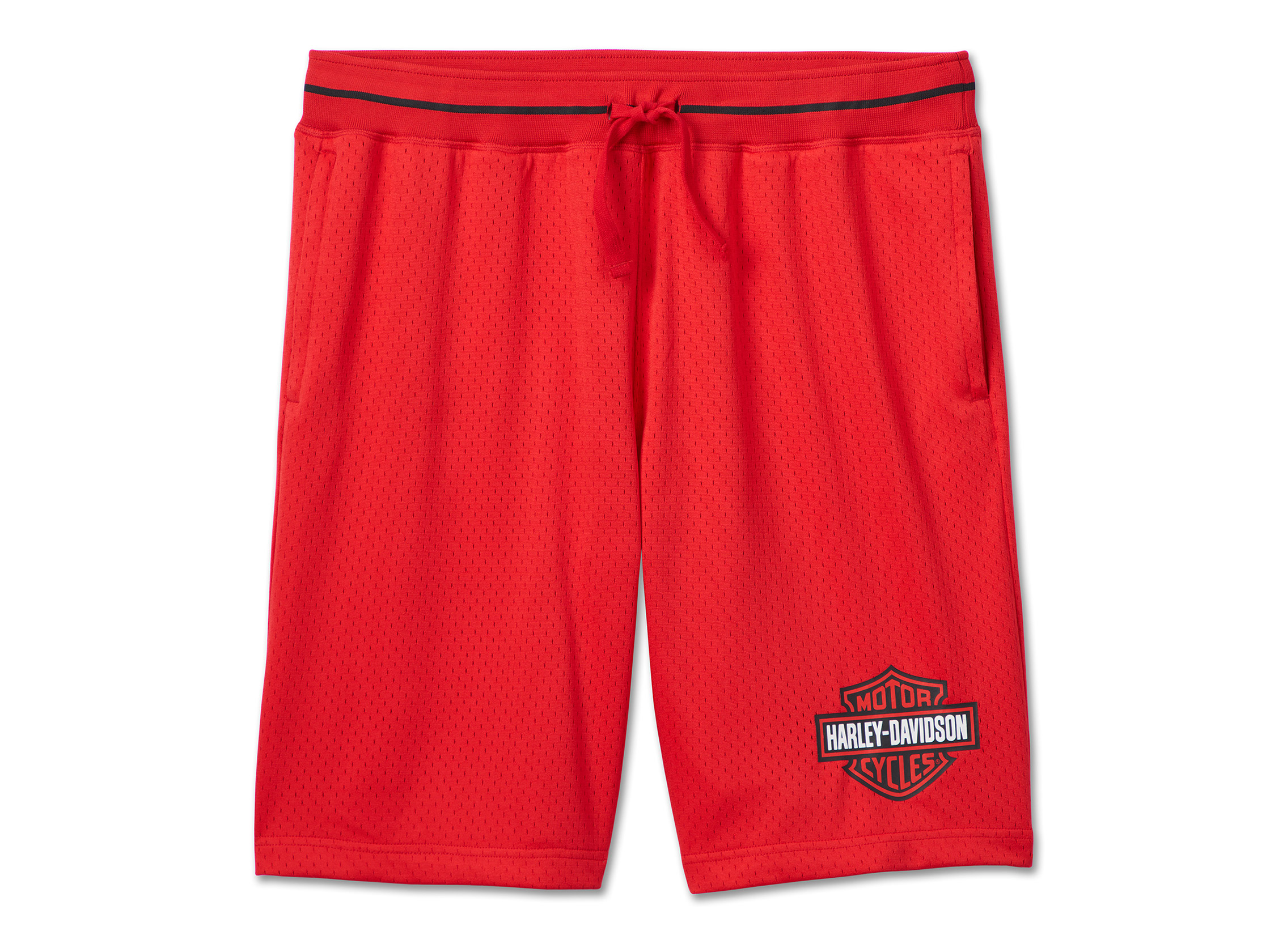 Bei unseren Boiling Point Mesh-Shorts erhält der sportliche Stil ein echtes H-D-Upgrade. Diese knielangen Shorts für Herren in entspannter Passform sind aus schwerem Athletic-Mesh aus Polyester gefertigt. Die sportliche Silhouette verfügt über einen elastischen Kordelzugbund und eine Eingrifftasche mit Reißverschluss hinten, damit Du Deine wichtigsten Utensilien sicher verstauen kannst. Auf der Vorderseite deutet unser legendärstes Motiv an, für welche Motorradmarke Dein Herz schlägt.