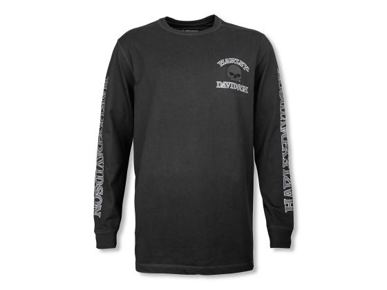Bequem, auffällig, legendär ... Das Willie G" Skull Long Sleeve T-Shirt ist all das. Gefertigt in entspannter Passform aus superweichem Jersey aus Baumwolle und mit einen Halsausschnitt und Bündchen mit Rippstrick versehen, um die Form zu halten. Dieses Langarm-T-Shirt für Herren begeistert mit dem furchtlosen Willie G Skull sowie unserem doppelten Logoschriftzug auf den Ärmeln. Kleine Geschichtslektion: Obwohl der Skull eine seiner bekanntesten Kreationen ist, hat Willie G. Davidson auch mehrere Motorräder entworfen, darunter die 1971er FX Super Glide® und die 1977er FXS Low Rider®.