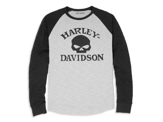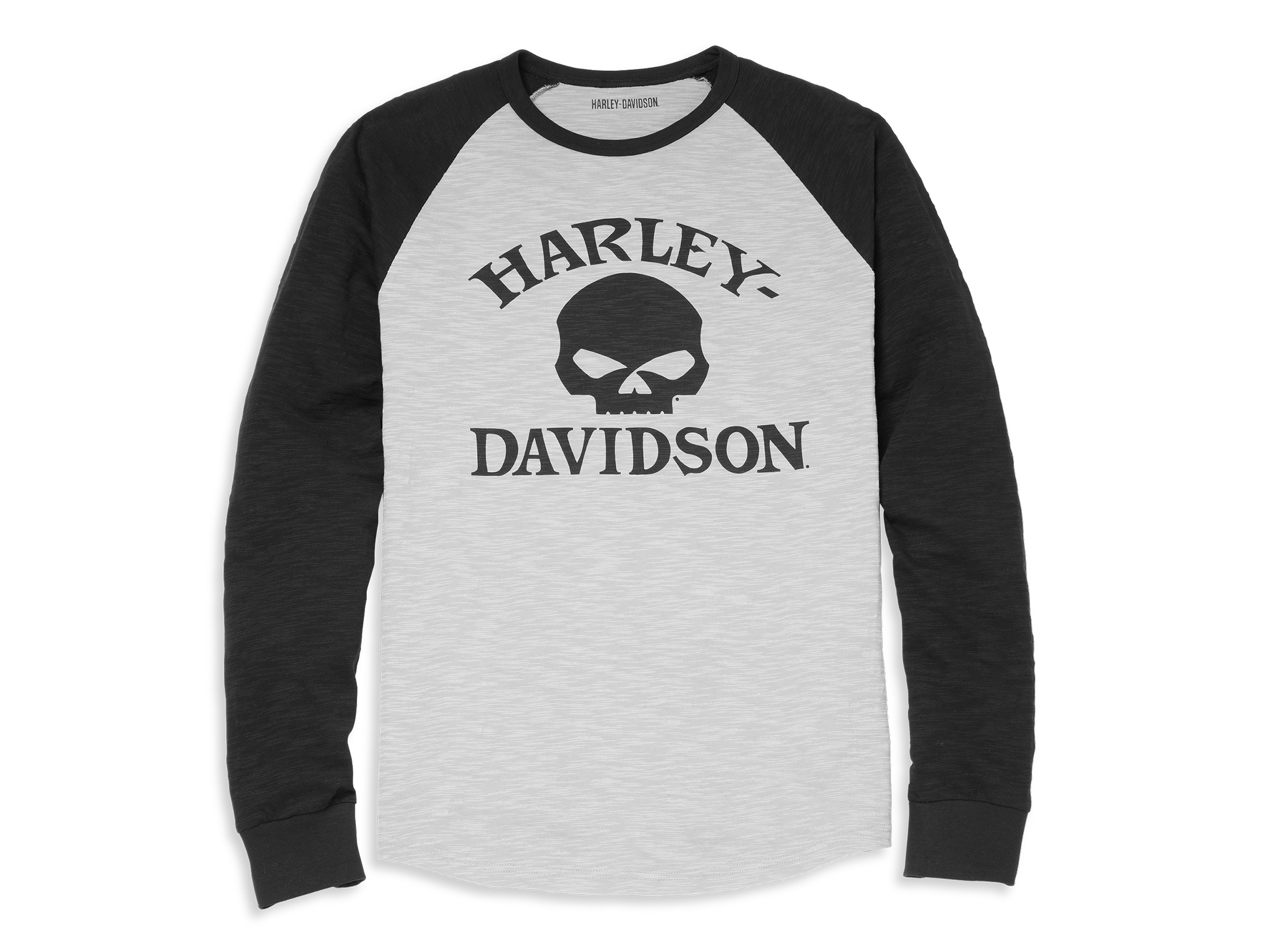 Unser Willie G" Skull Raglan Graphic Tee vereint Sportlichkeit und Rallye-Enthusiasmus. Es ist aus weichem Baumwoll-Slub-Jersey gefertigt, der für ganztägigen Tragekomfort sorgt und einen strukturierten Look verleiht. Der Rippstrick am Halsausschnitt und an den Ärmelbündchen sorgt dafür, dass es seine Form behält, während die kontrastierenden Raglanärmel dem klassischen Baseball-Shirt-Stil treu bleiben. Abgerundet wird das Shirt durch eine knallige Version unseres beliebten Logos, das Willie G. Davidson erstmals für die Daytona Bike Week 2000 kreierte.