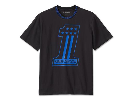 Mit unserem #1 Racing Short Sleeve T-Shirt ist beeindruckender Stil ein Kinderspiel. Gefertigt in entspannter Passform aus schwerem Jersey aus Baumwolle. Für einen gehobenen Look verfügt dieses Herren-T-Shirt über unser Branding auf einem Halsausschnitt aus Intarsien-Strick. Die Rückseite ist frei gehalten, damit unser #1 Logo die ganze Aufmerksamkeit auf sich ziehen kann. Kleine Geschichtslektion: Dieses Motiv feierte sein Debüt 1969 anlässlich unseres AMA Grand National Championship Titels.