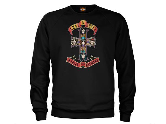 Harley Guns N' Roses Sweatshirt "Appetite for Destruction" mit GNR und House of Flames Munich Händler-Aufdruck auf der Rückseite. Extrem weiches und bequemes Sweatshirt aus 50% Baumwolle und 50% Polyester.