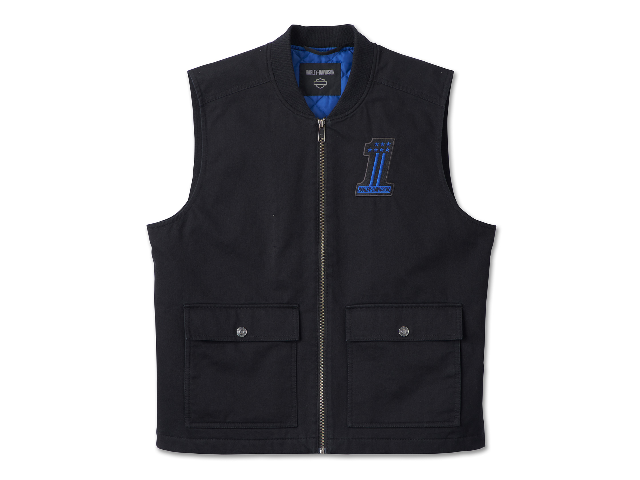 Die #1 Racer Weste peppt deinen Look auf und huldigt gleichzeitig unserem Flat-Track-Erbe. Sie ist aus robustem Twill aus weich gewaschener Baumwolle gefertigt und hat ein gestepptes Polyester-Futter für zusätzliche Wärme. Diese Herrenweste mit Frontreißverschluss verfügt über Taschen mit doppeltem Eingriff und in die Motive eingearbeitetes reflektierendes Material für erhöhte Sichtbarkeit. Mit unserem #1 Logo auf der Vorderseite und einem auffälligen Rennsport-Tribut auf dem Rücken. Kleine Geschichtslektion: Dieses #1 Logo feierte sein Debüt 1969 anlässlich unseres AMA Grand National Championship Titels.