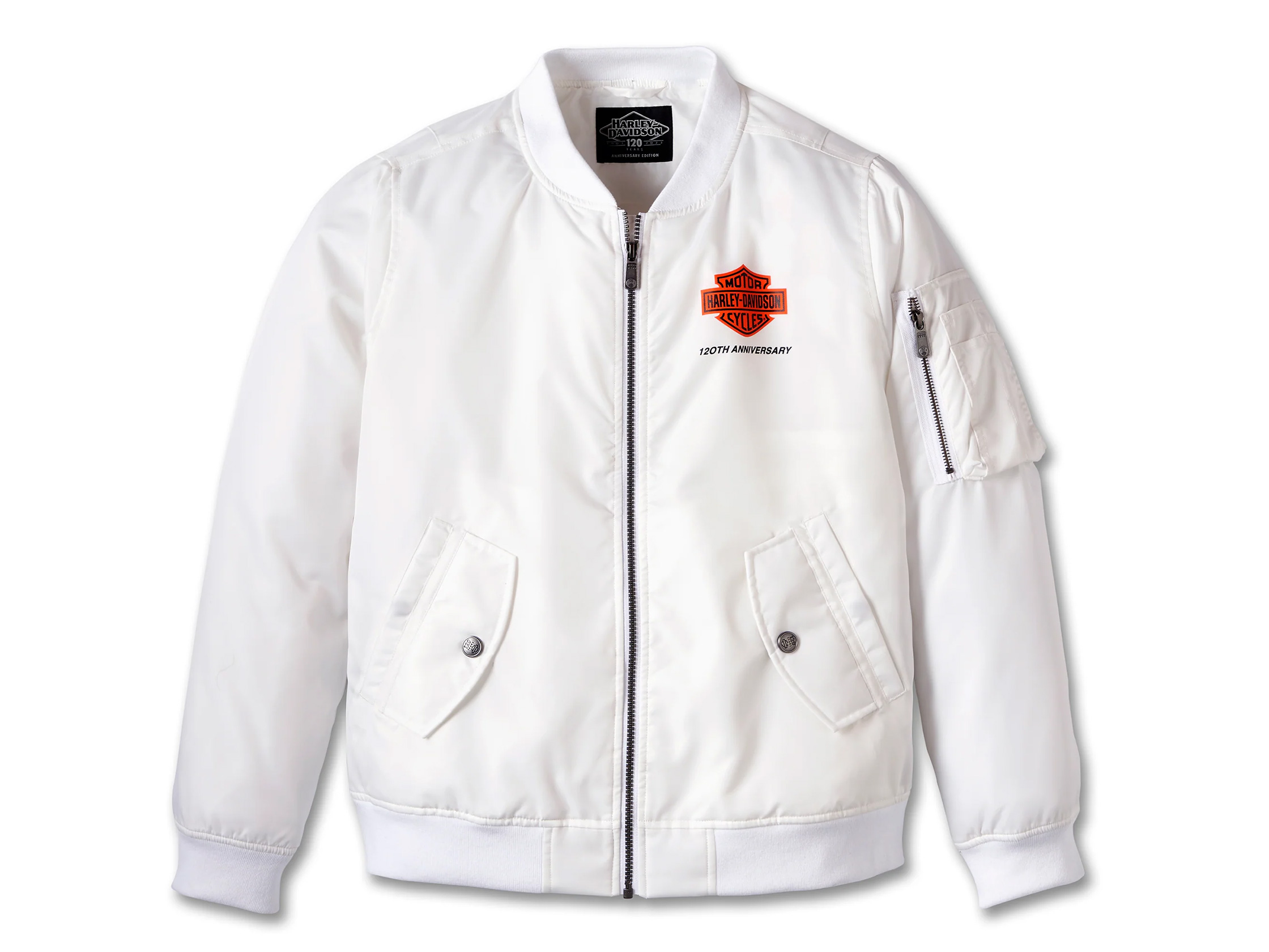 • Design-Details: Bomber-Schnitt. Gestepptes Windschutzleiste entlang der Knopfleiste. Schulterabnäher auf der Rückseite. Gerippter Strickkragen, Bündchen und Saum. Speziell gestaltete 120th Anniversary-Beschläge, Innenband und Etikettierung.