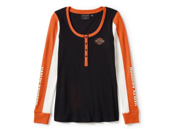 Für den klassischen Stil in unserer ikonischen Farbpalette - das Essential Henley. Dieses Langamshirt für Damen ist ein lässiges Basic und besteht aus atmungsaktiver Baumwolle mit Elastan-Anteil für Elastizität und Rippstrick für einen strukturierten Look (für einen genauen Blick gerne reinzoomen). Es hat einen schmeichelhaften Rundhalsausschnitt, kontrastierende Nähte und Ziernähte. Unsere Grafiken zieren die Vorderseite und verlaufen in bewährter Harley Manier über die Ärmel.