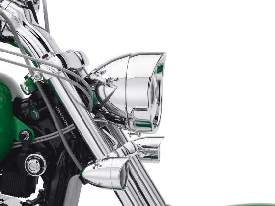 Diese verchromten Zierschirme rücken den Scheinwerfer in seinem Gehäuse etwas nach hinten und verleihen der Lampenschale ein traditionelles "Augenbrauen"-Design. Der Zierring streckt das Profil der Maschine und unterstützt damit deren langes, schlankes Erscheinungsbild. Für echtes Custom- Design können Sie außerdem mit passenden Zierschirmen für Zusatzscheinwerfer und Blinker sorgen.